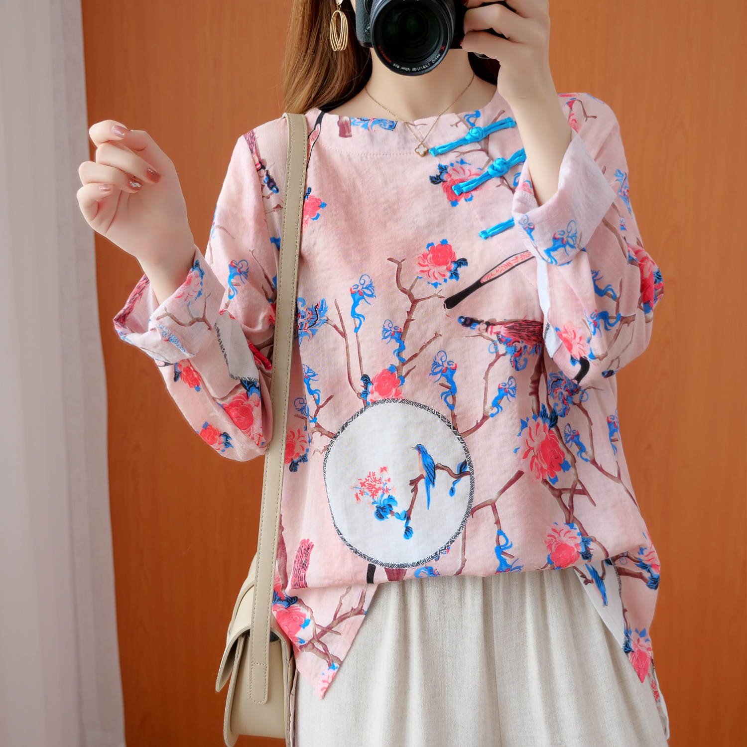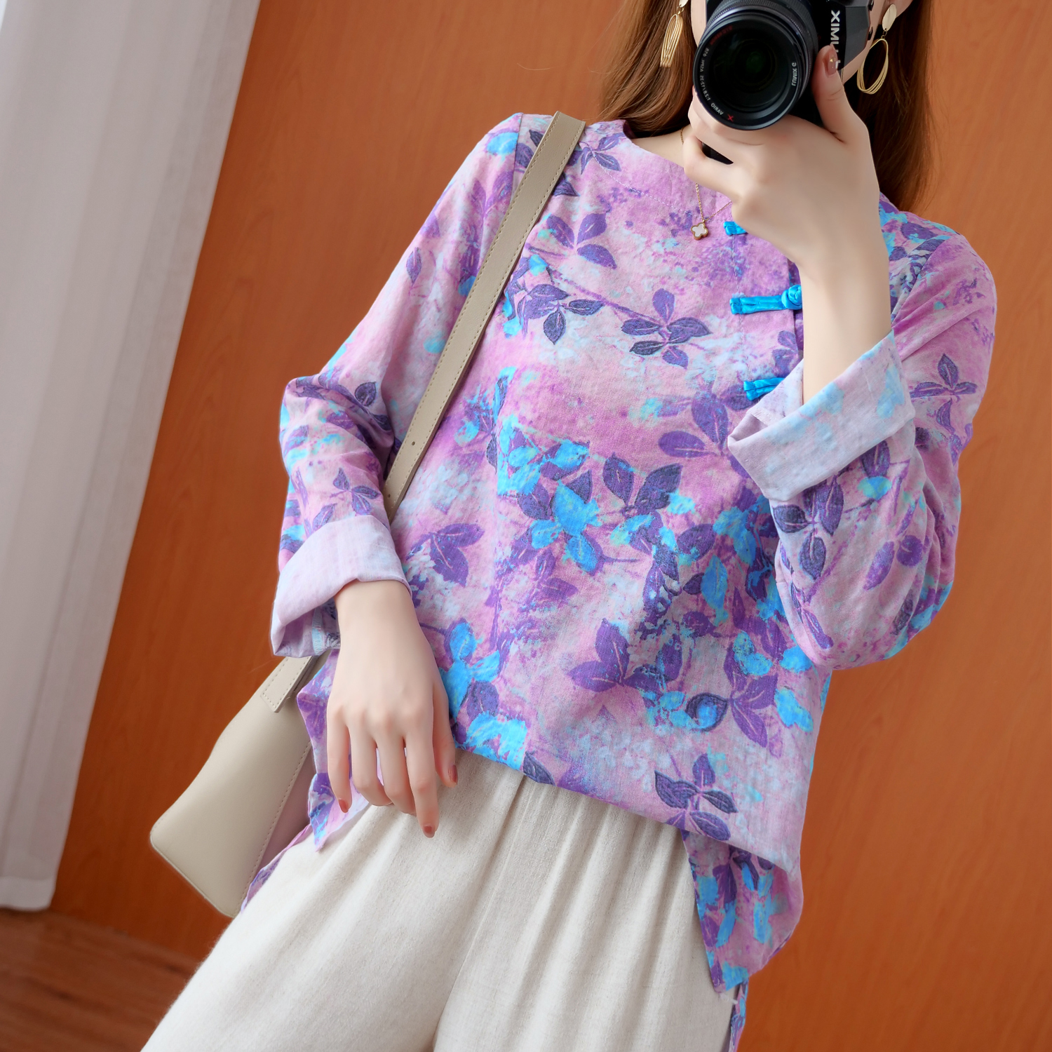 Chinese style slanted cotton hemp top women autumn long sleeves sassafras shirt loose antique plate buckle hemp material floral tea suit