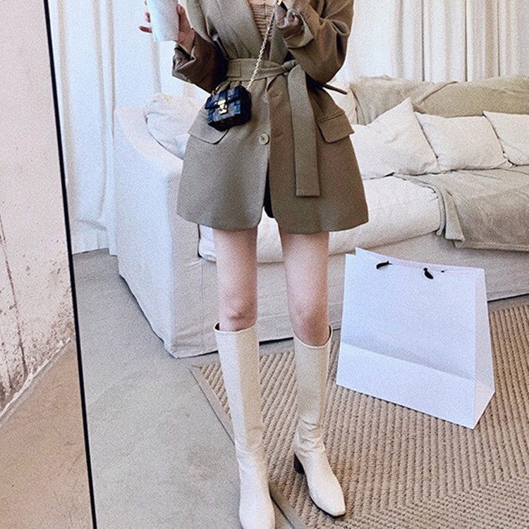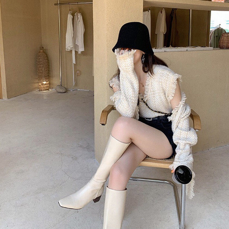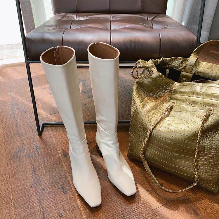 ins strong push giant beauty self-leaving ~ rice white genuine leather coarse heel knight long boots and knee boots high cylinder boots woman