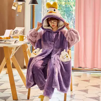 Coral velvet robe women's autumn and winter thickened plus velvet warm new pajamas women's bathrobe long version flannel home wear