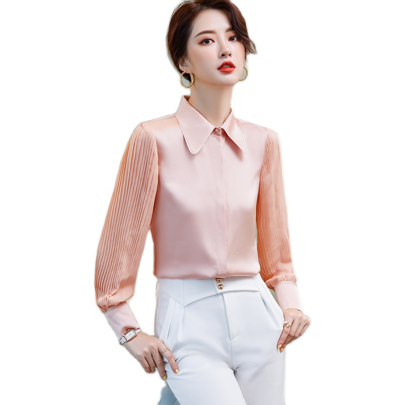Anti-wrinkle shirt women's Korean version 2020 autumn Chiffon large collar pink shirt Long sleeve temperament lantern bubble sleeve top