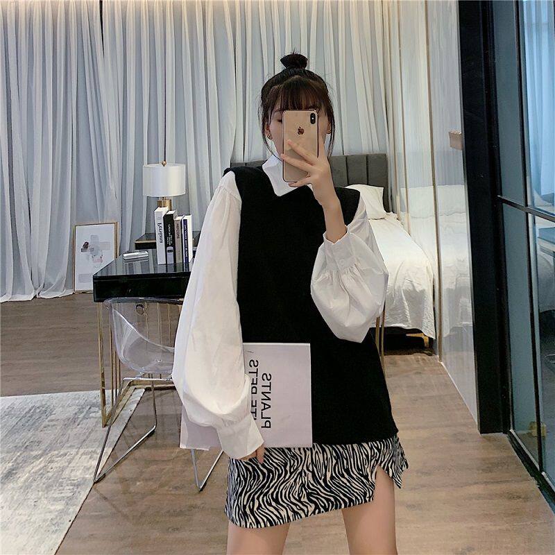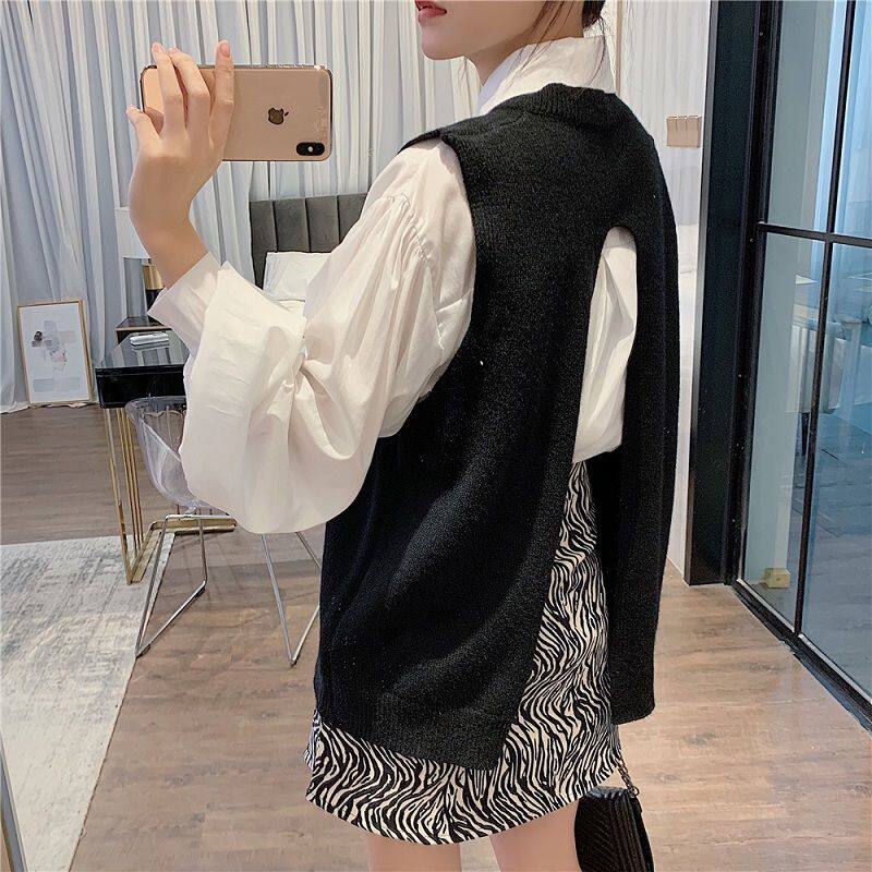 Leaky back blouses suit Ruback knit Machia lantern sleeves shirt open fork zebra half body dress with three sets of women