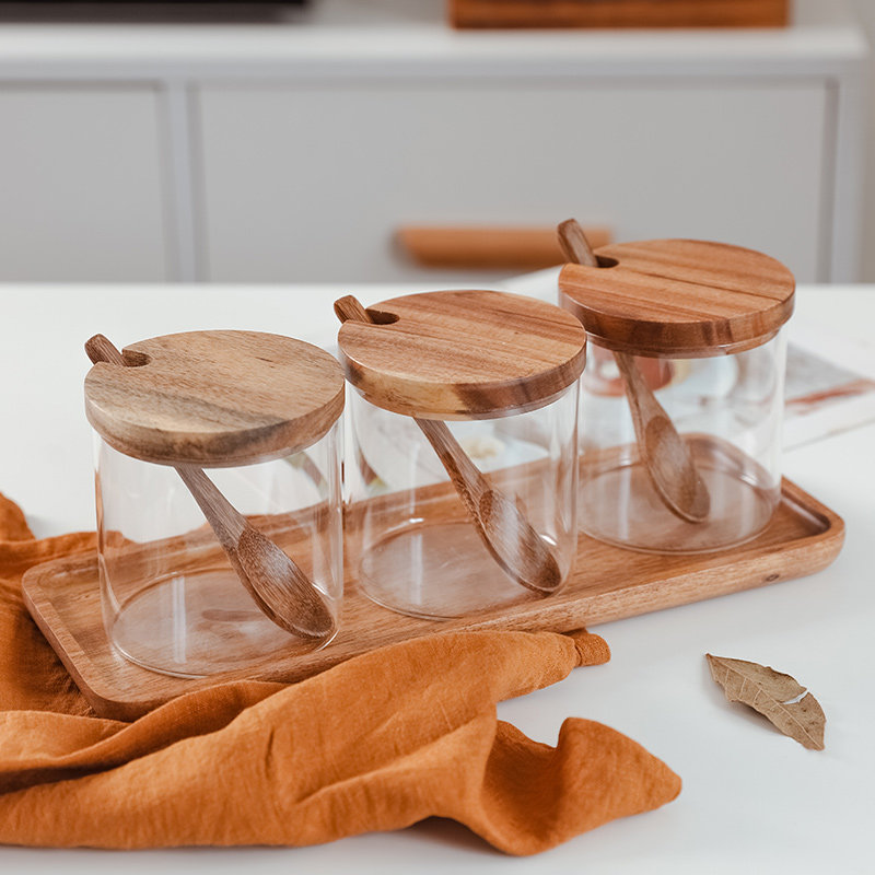 Aijia home glass seasoning jar kitchen utensils salt sugar jar acacia wooden lid wooden spoon seasoning box set combination - Taobao
