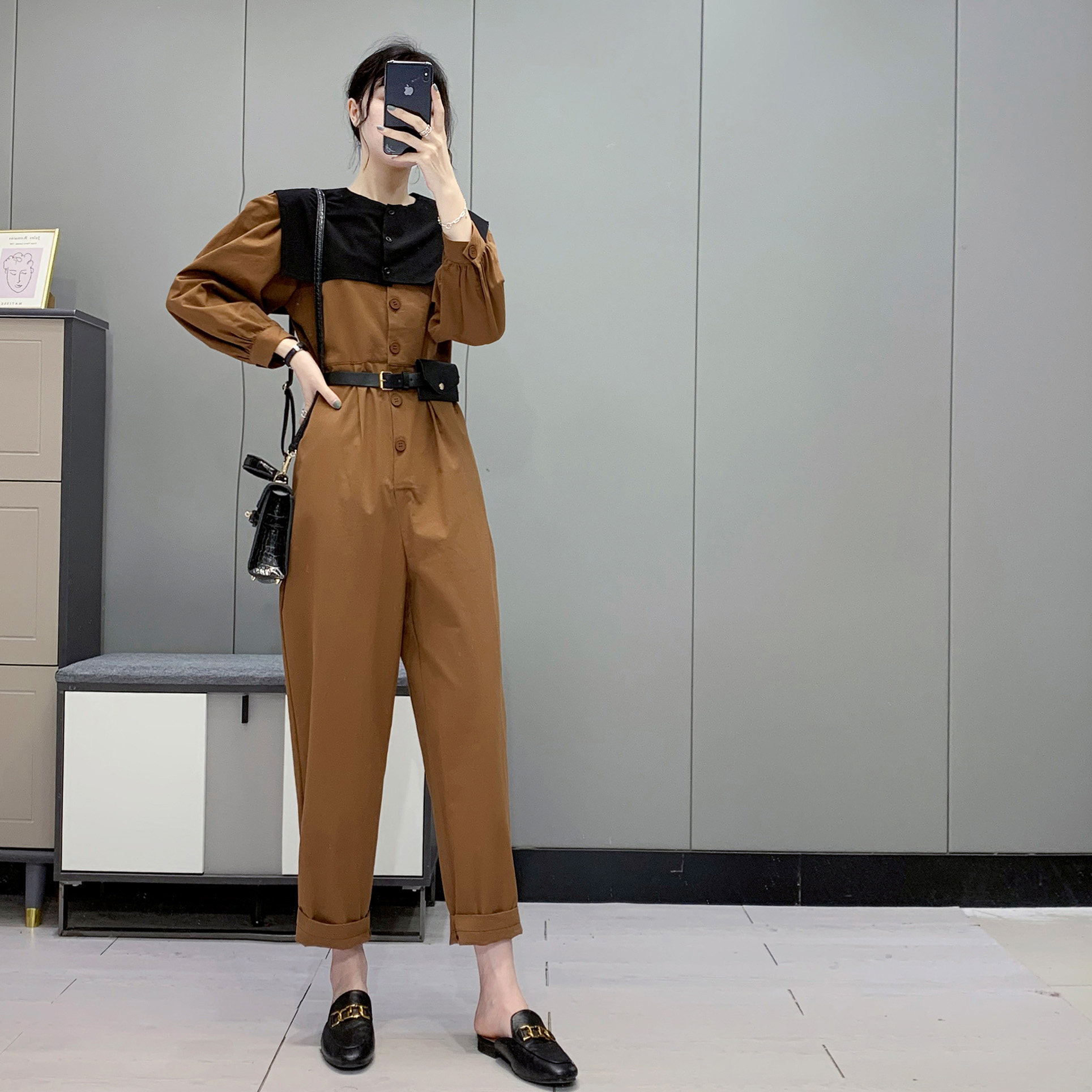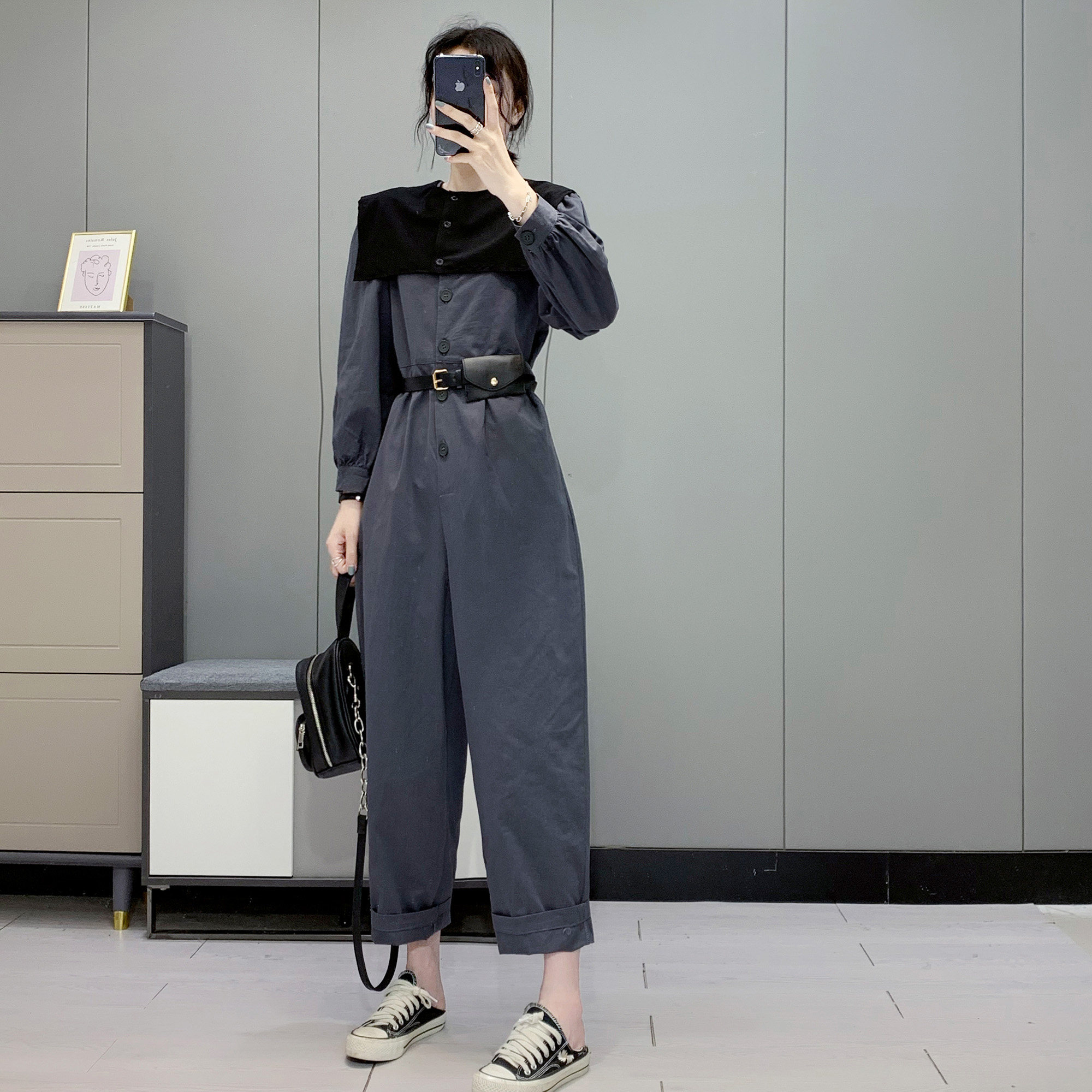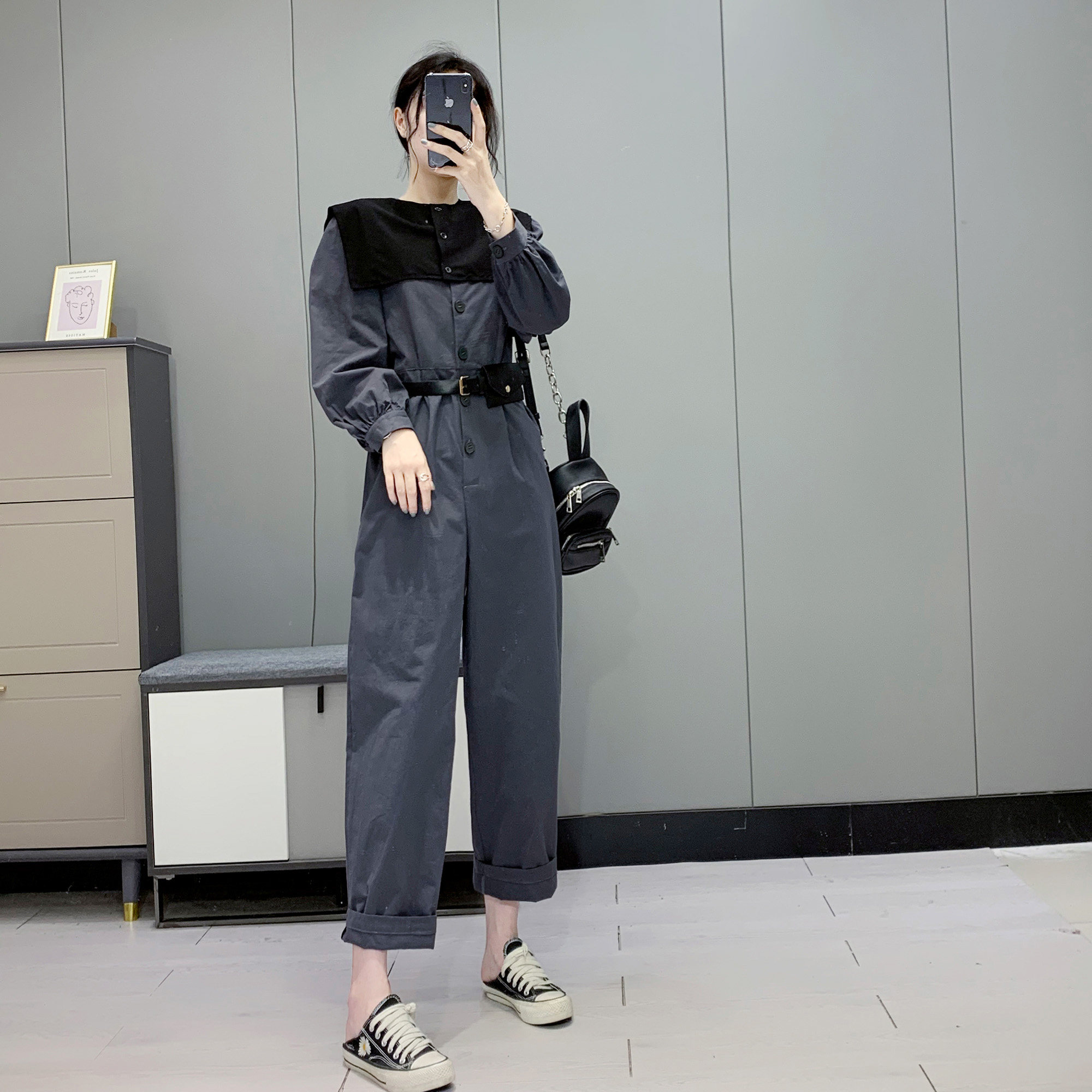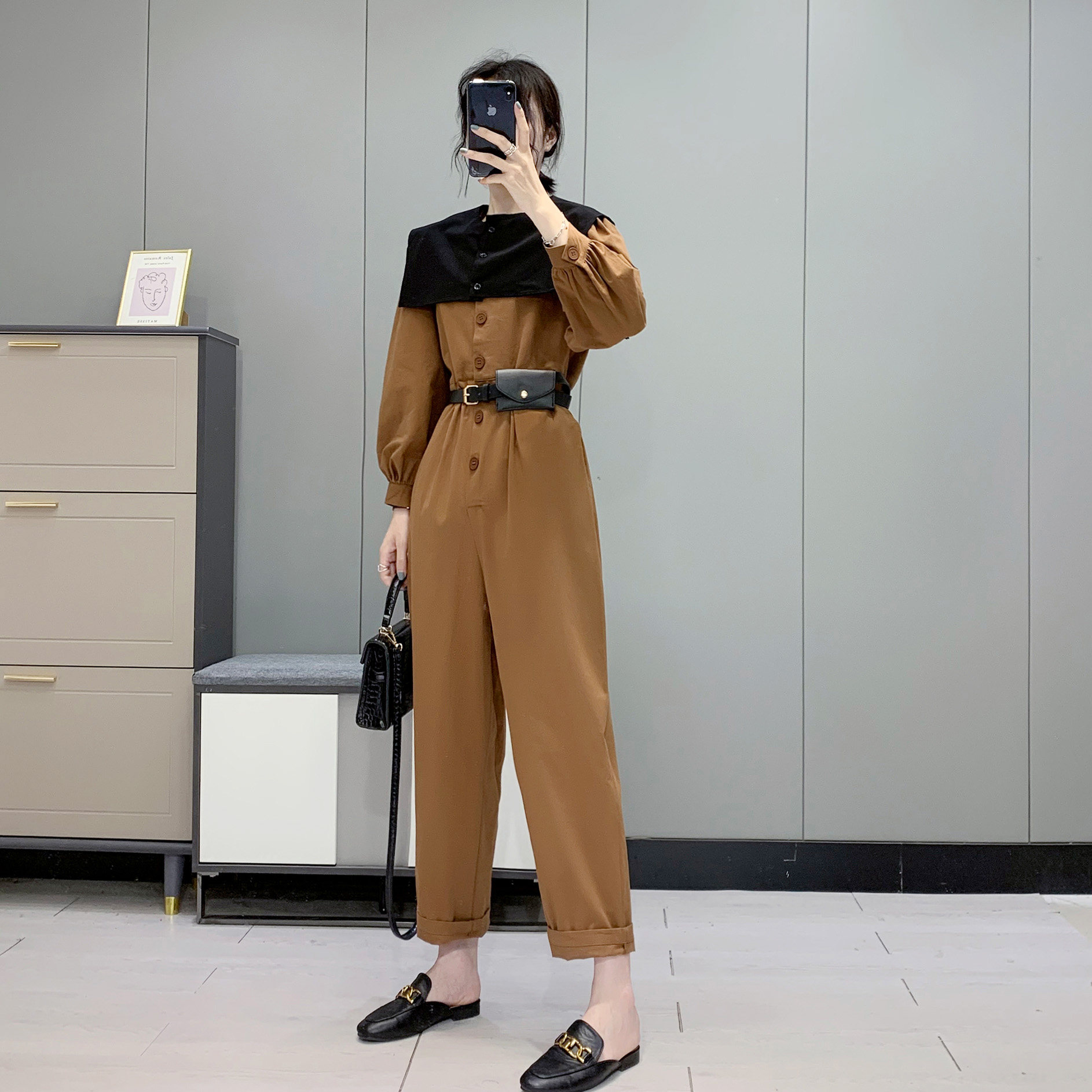 299 Korean Pure Color Fashion Jumpsuit + Removable Shawl False Collars Fall New Women's Bubble Sleeves
