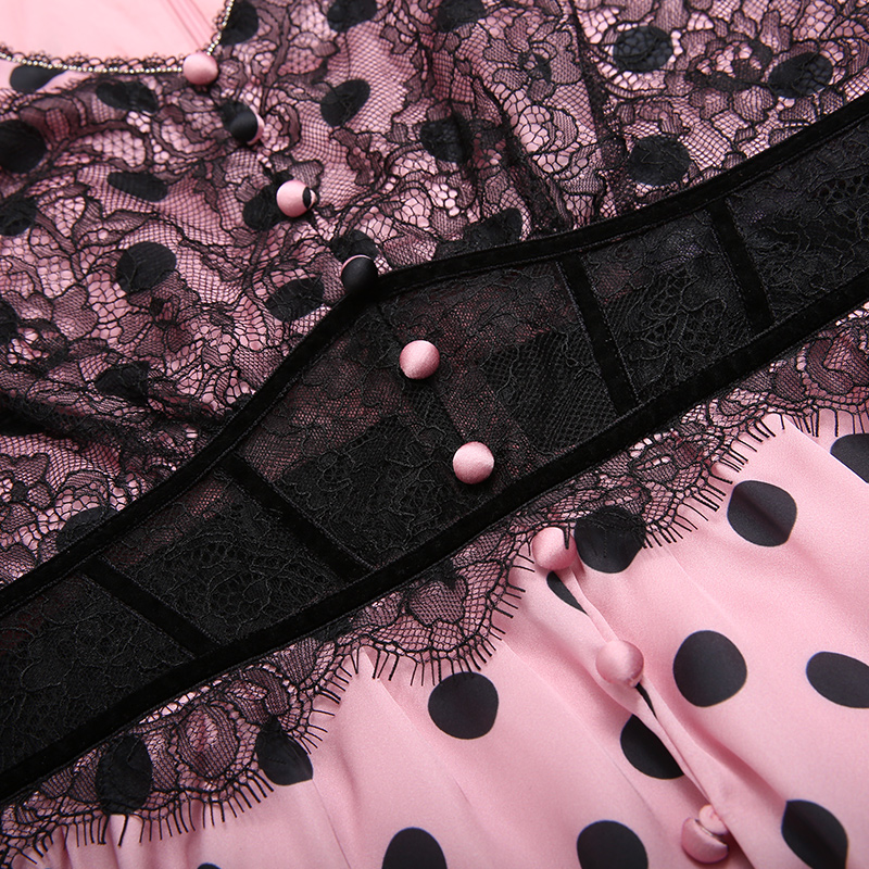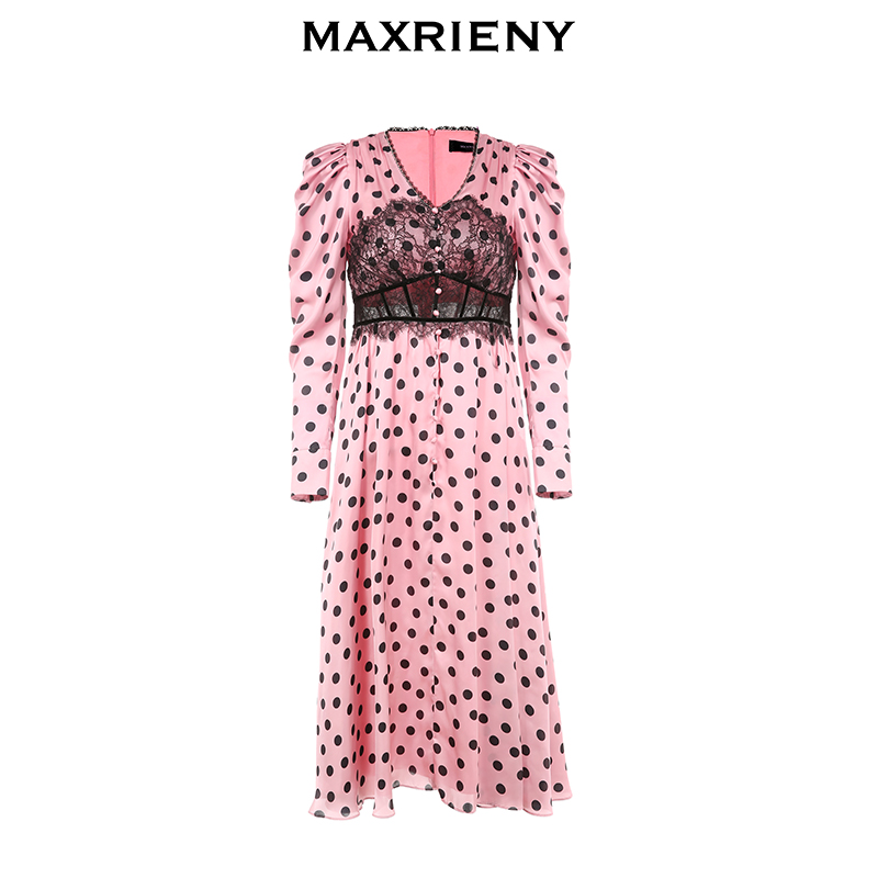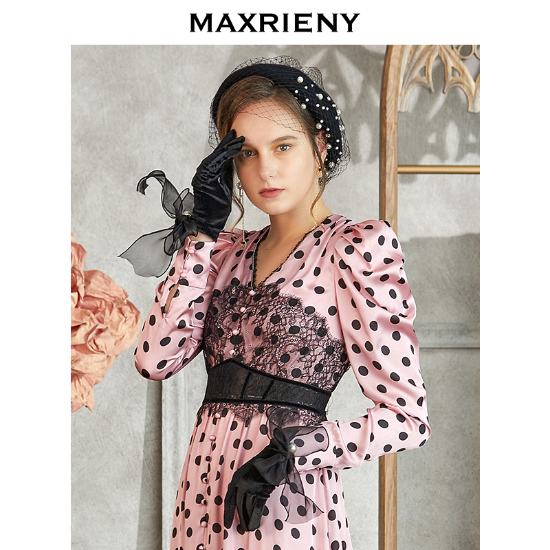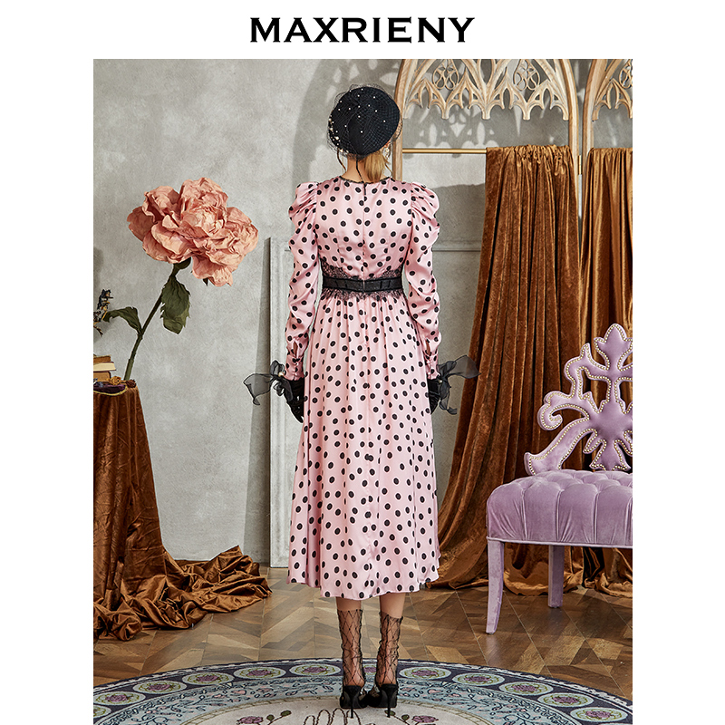 MAXRIENY2020 fall new V collar large hem skirt palace windfall waist display slim medium long version of polo dot ocean dress