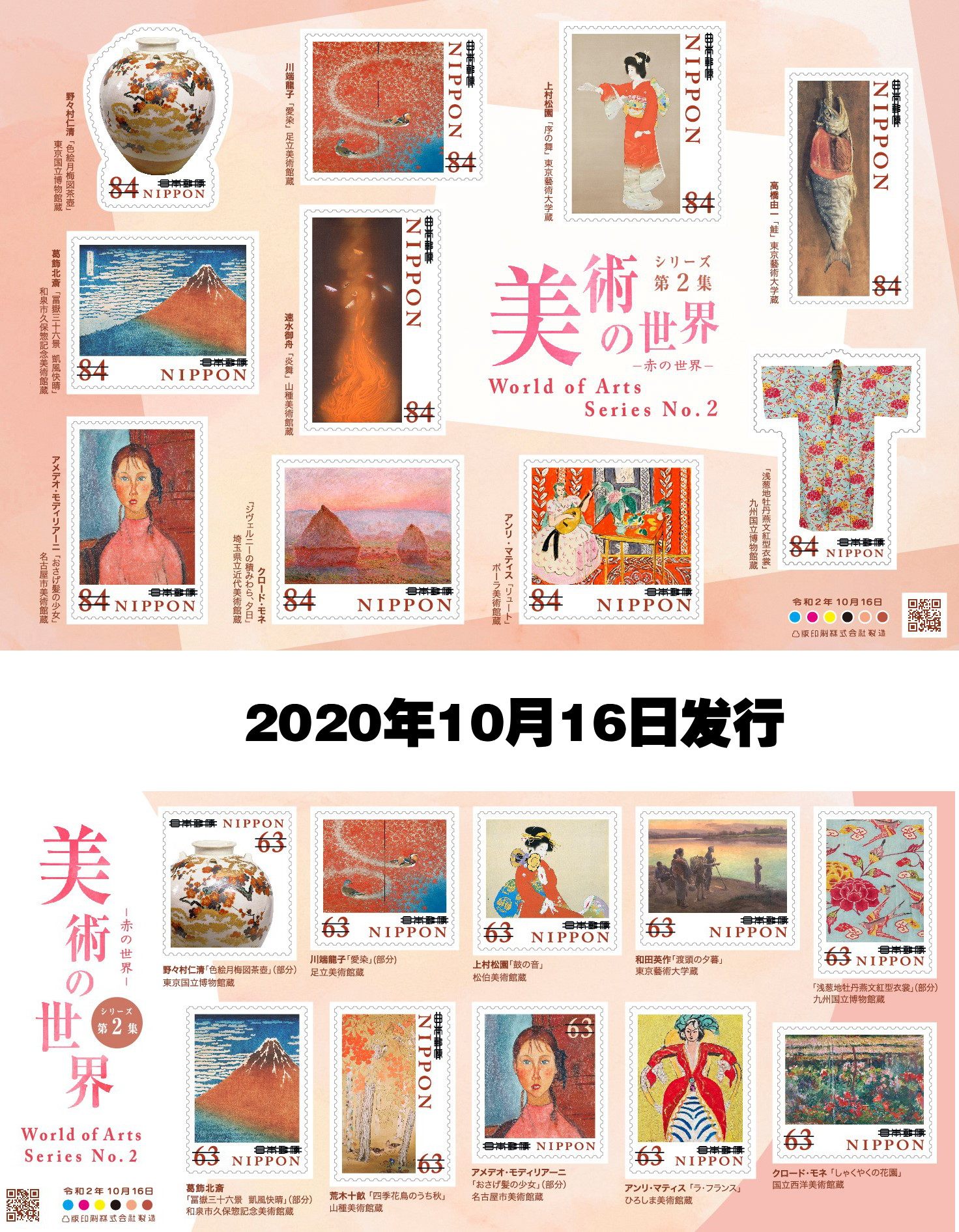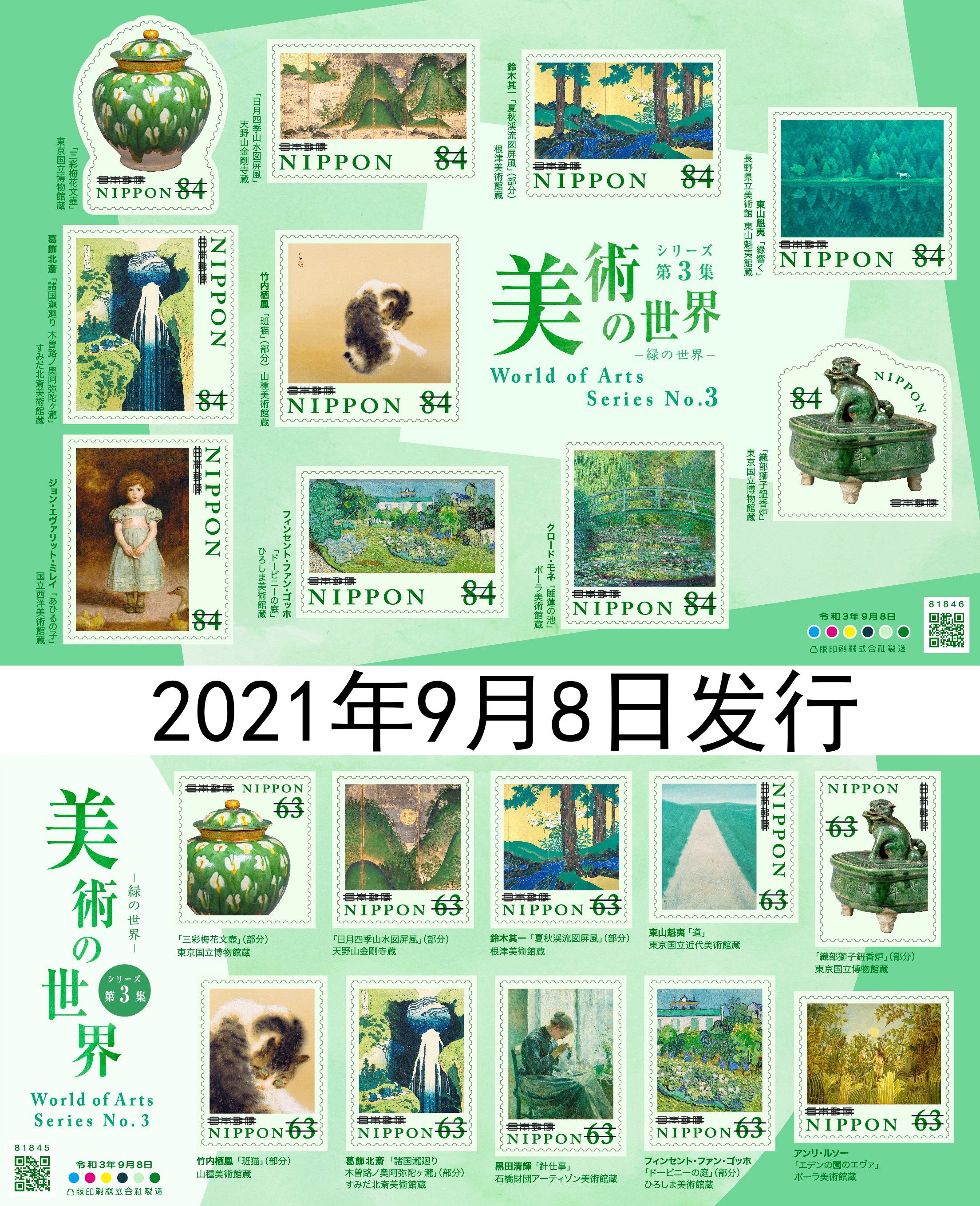 Japan's new stamps - world of fine arts Blue Red Green Katsushika Hokusai Story Club Famous paintings