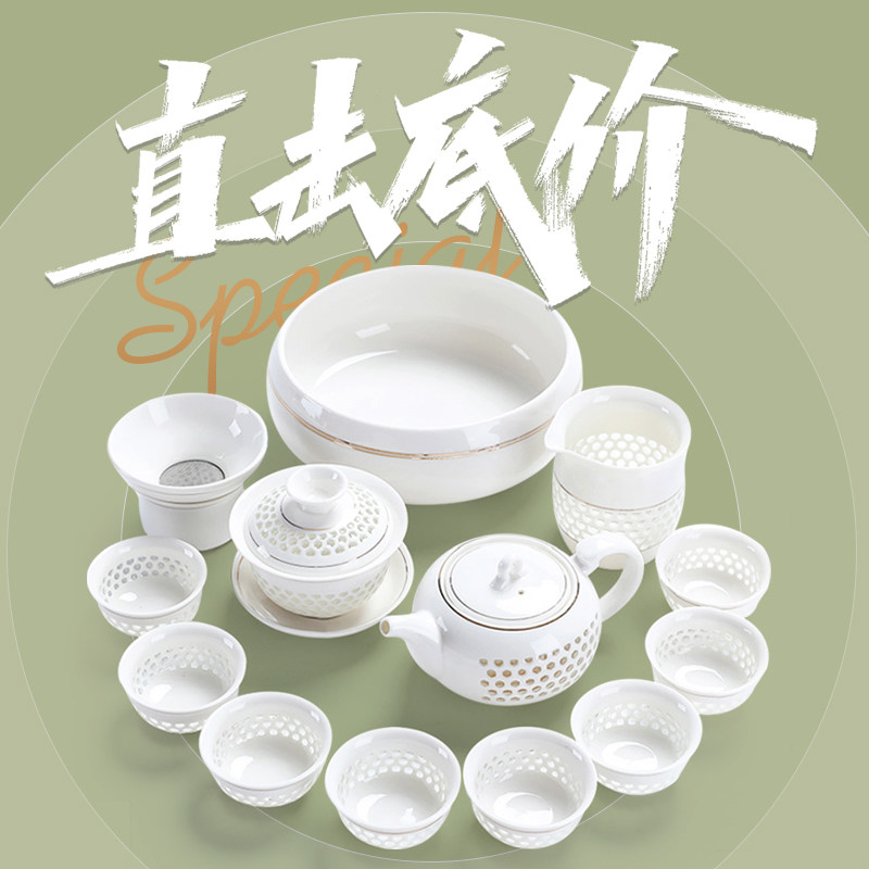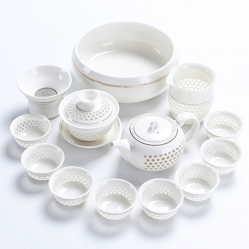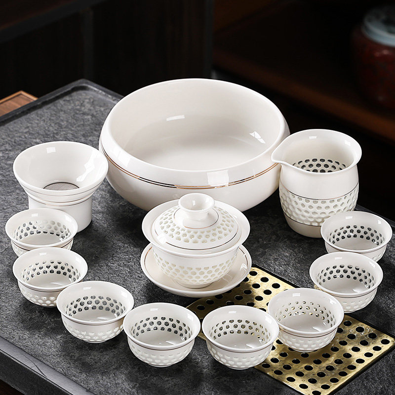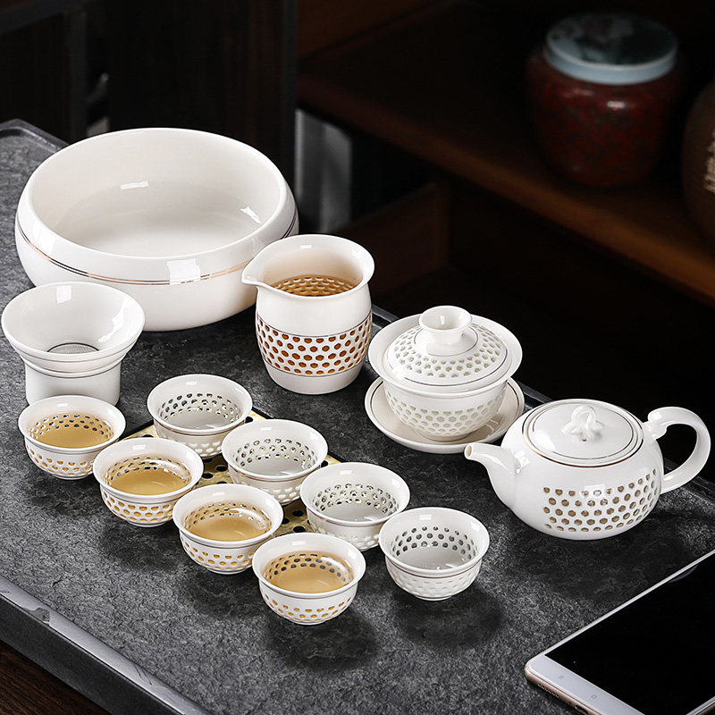 Light and luxurious ceramic hollowed-out home minimalist Gongfu tea tea cup guests white porcelain suit teapot lid bowl bubble office