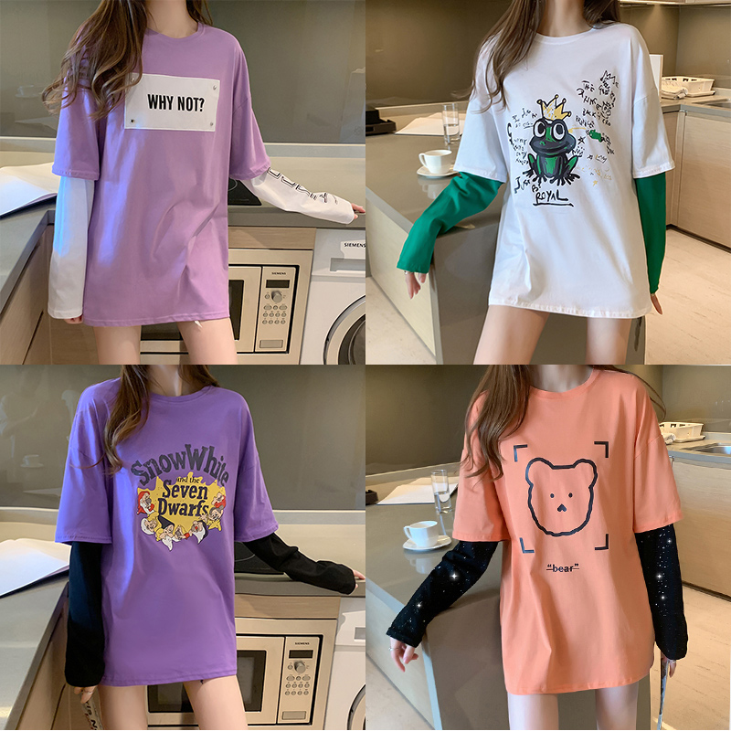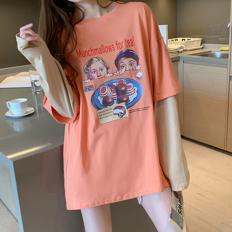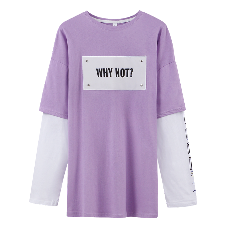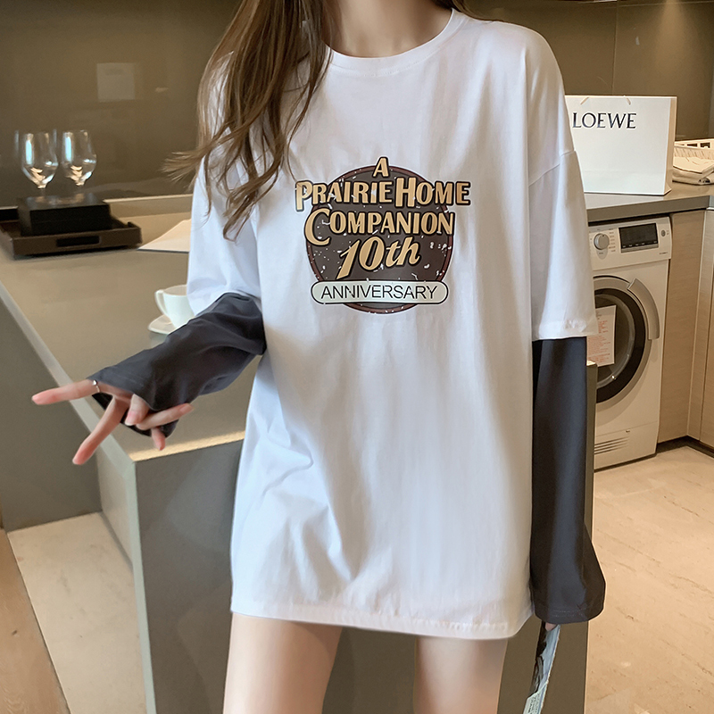 2022 original juku fitted with new long sleeves fake two pieces of letters printed T-shirt skirts female students loose Korean version of blouses