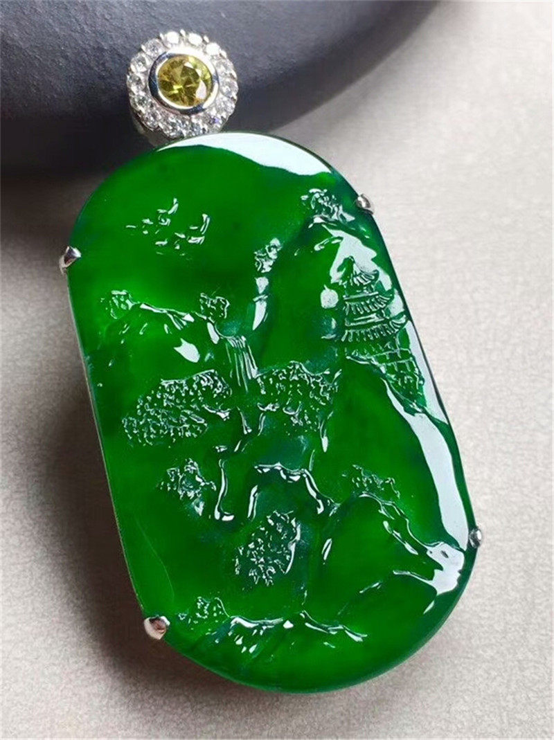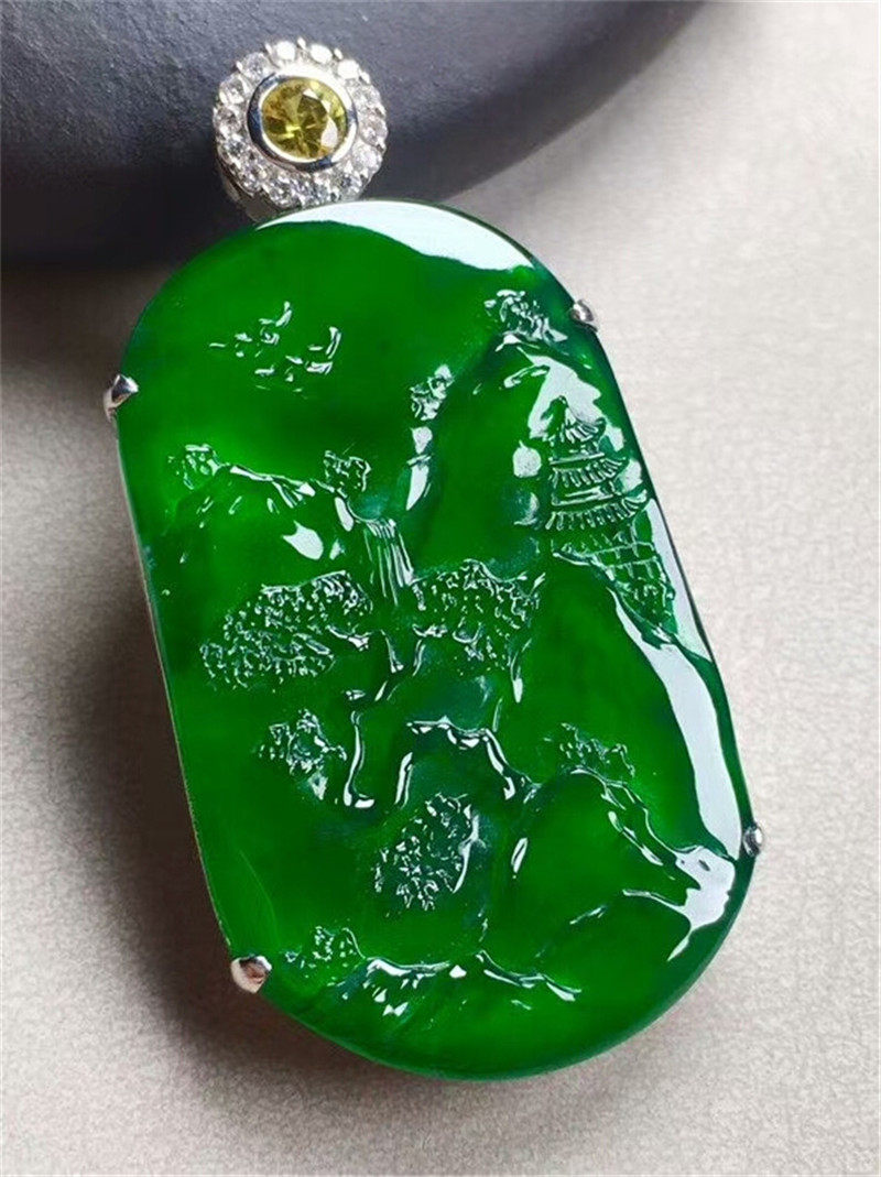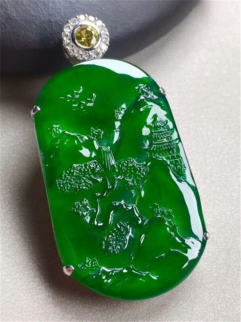 Myanmar natural jade Yang green landscape brand pendant 18K inlaid with old pit A goods ice species floating flower Buddha pendant male and female models