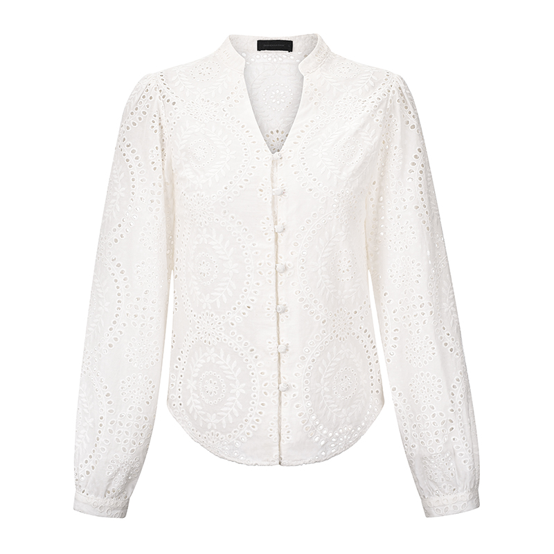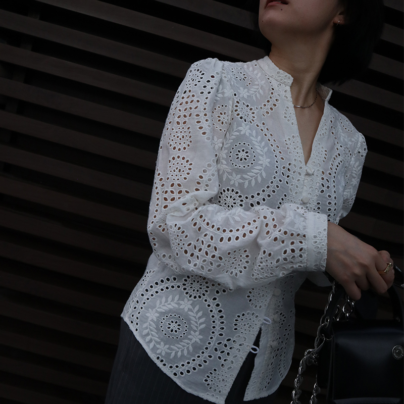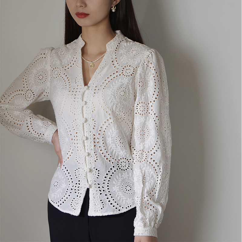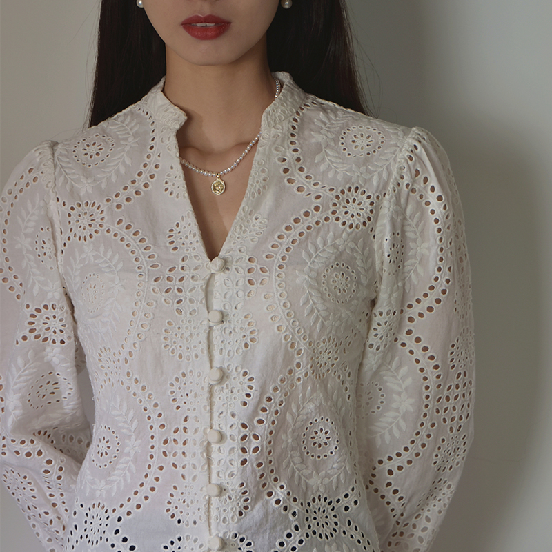 DEARJOANN French style retro white shirt pure cotton bubble sleeves hollowed-out embroidery lace shirt design feeling small