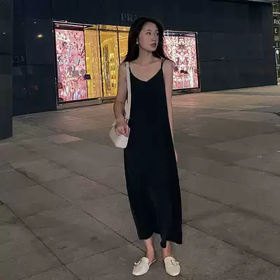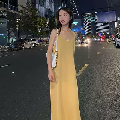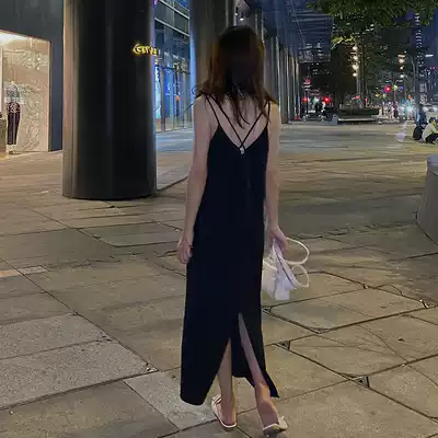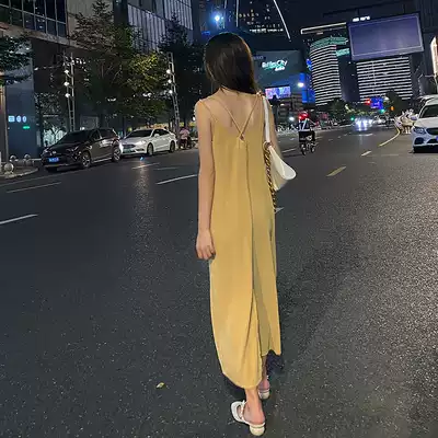 Concubine careful machine backless sling dress women's back split V temperament loose thin acetic acid satin long skirt