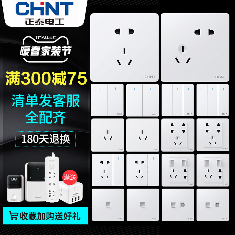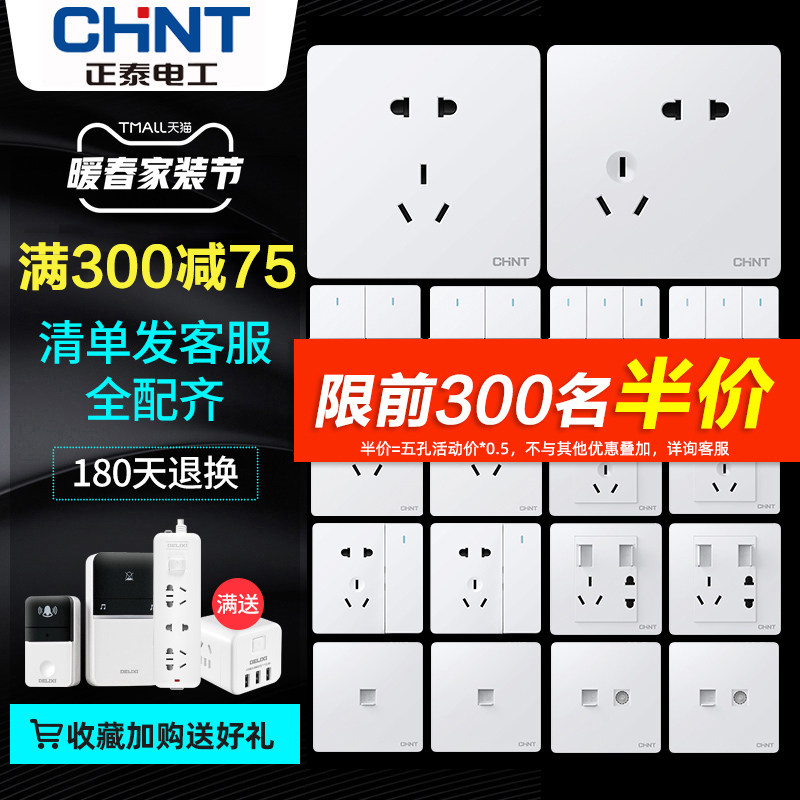 Positive five-hole plug, oblique five-hole plug, five-hole double USB air-conditioning socket, seven-hole socket, one open five-hole single control, one open five-hole double cut, one open three-hole 16A, one open single control, one open double cut, one open multi-control, two open single control Two open double