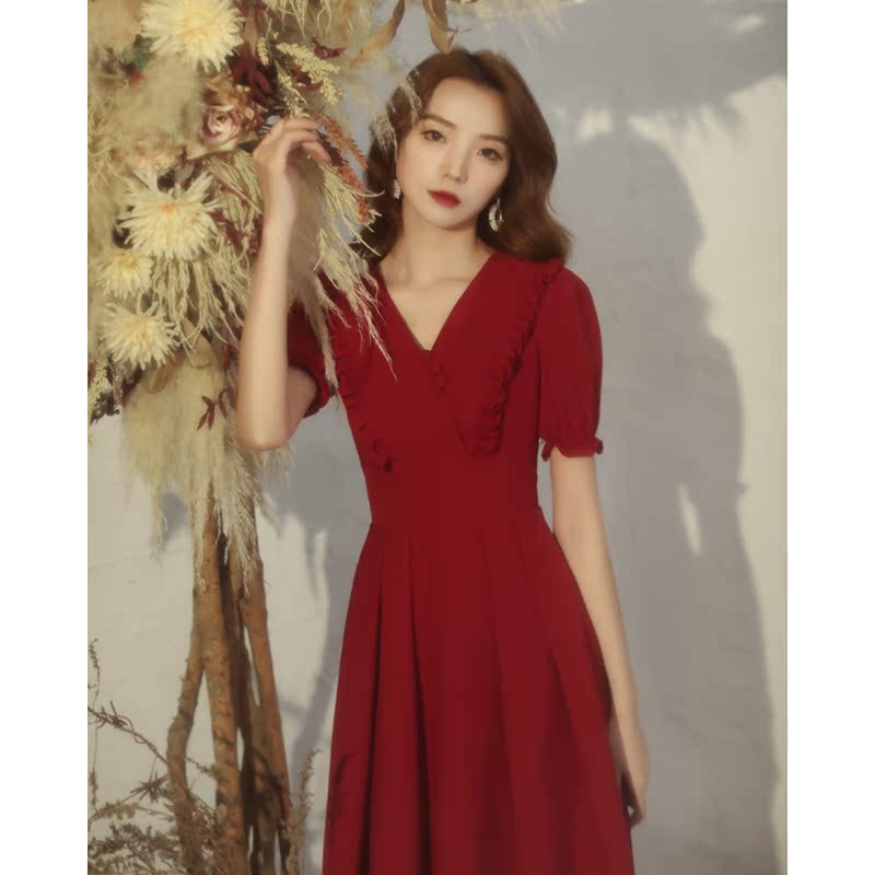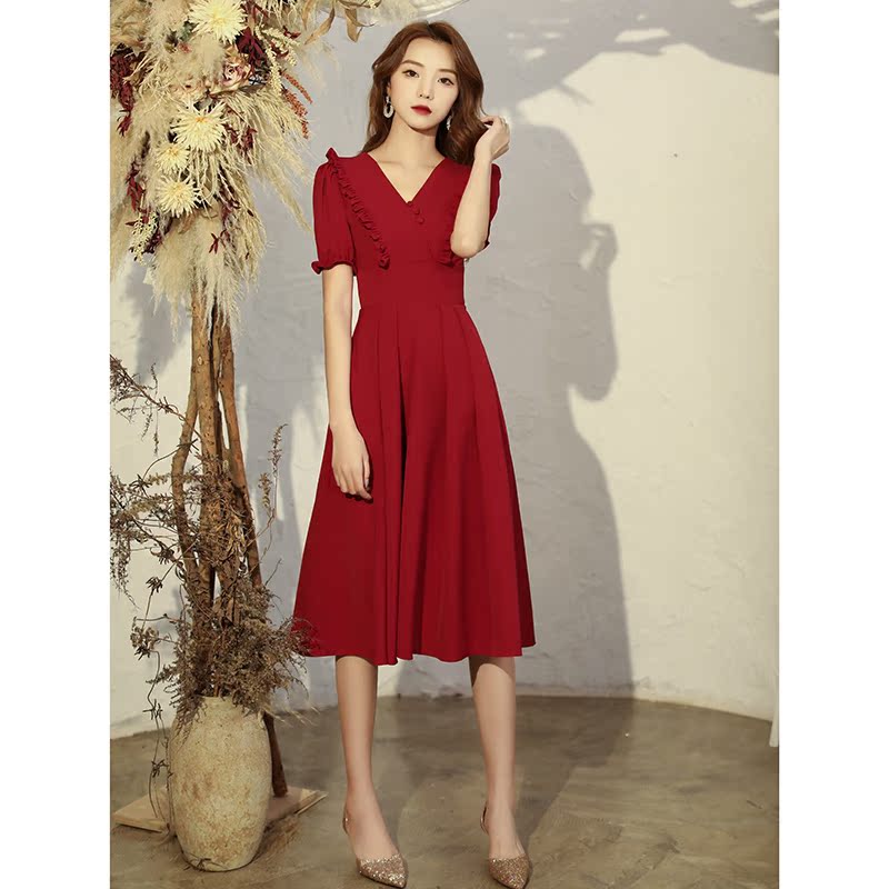 Toasting clothes brides can usually wear small wine red engagement dresses, women's back door dresses, simple wedding dresses