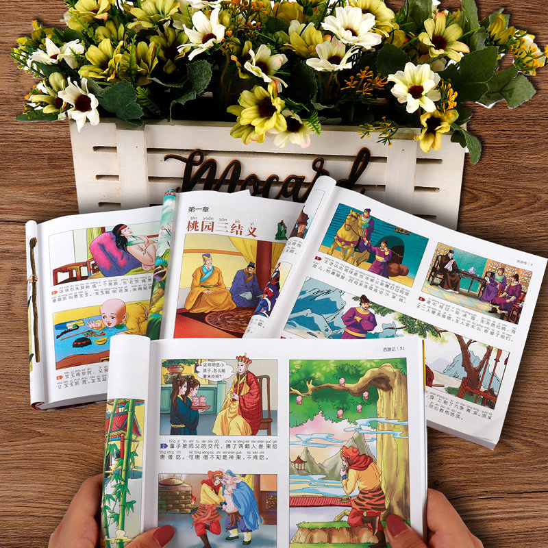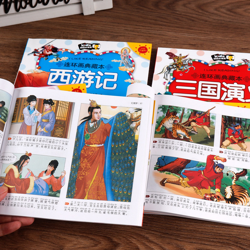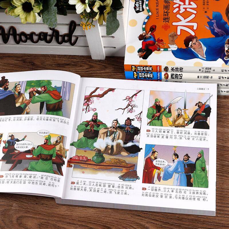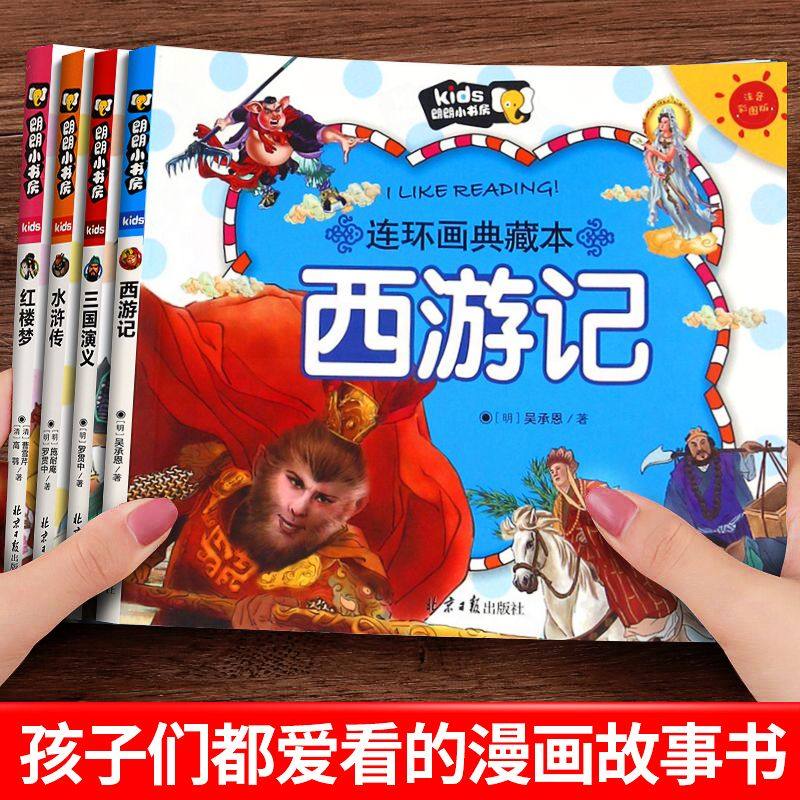 Four famous comic strips Full set of genuine primary school students first grade reading extracurricular books must read comic book picture book Journey to the West children's edition of the Three Kingdoms Romance of the Three Kingdoms Water Margin Dream of the Red Chamber Comic Edition Color Illustration Zhuyin Children with Pinyin Villain Book