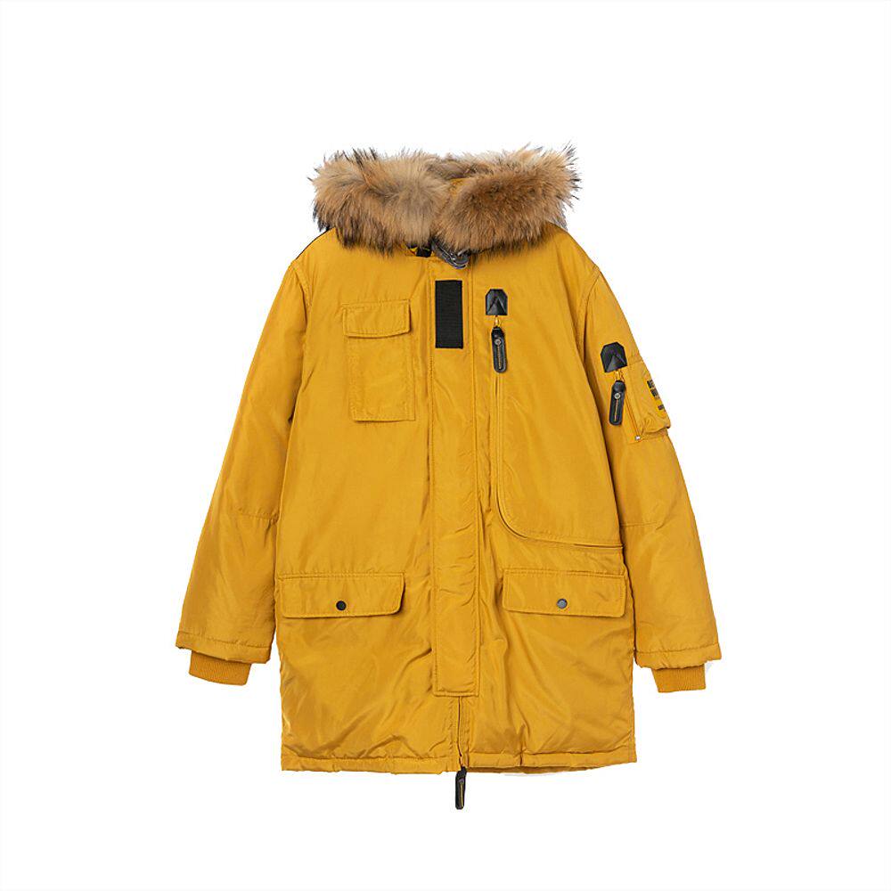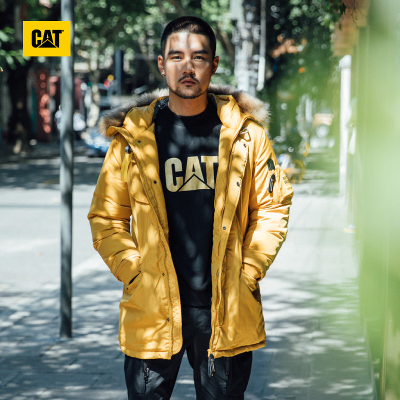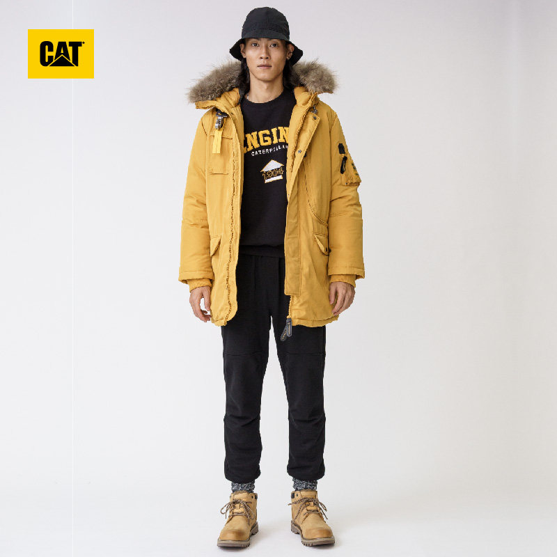 CAT Carter winter fur collar hooded workwear wind lock clasp leather design cold and warm long down jacket for men