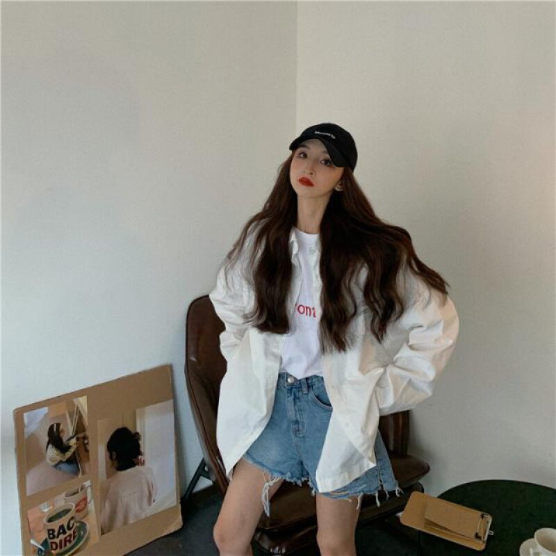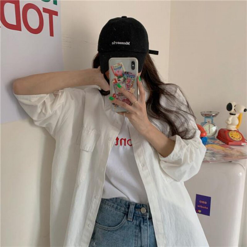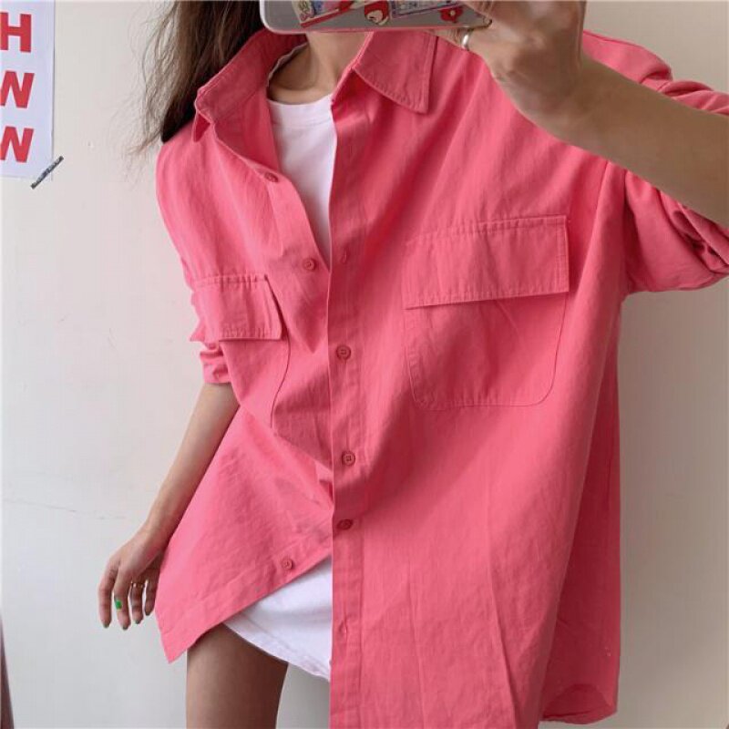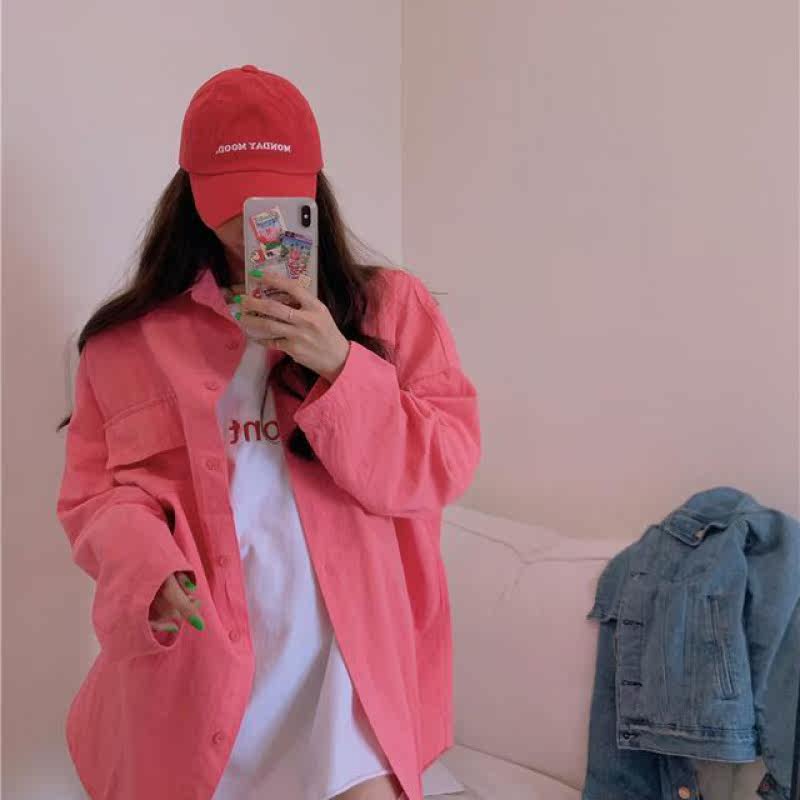 2022 fall new student Korean version loose bf windshirt pure female pocket turnover shirt round collar embroidered T-shirt