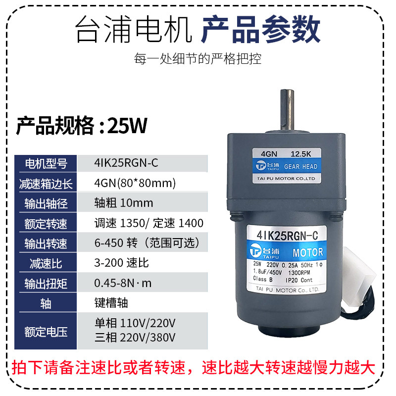 TAIPU25W220V AC single-phase gear speed regulating motor deceleration motor 4IK25RGN-C low-speed motor