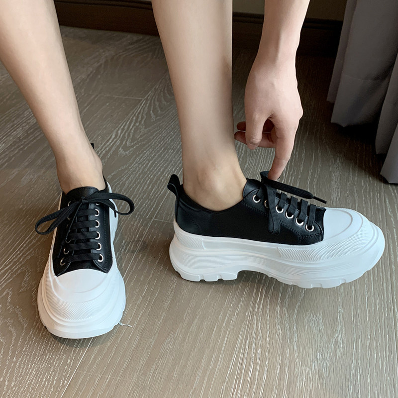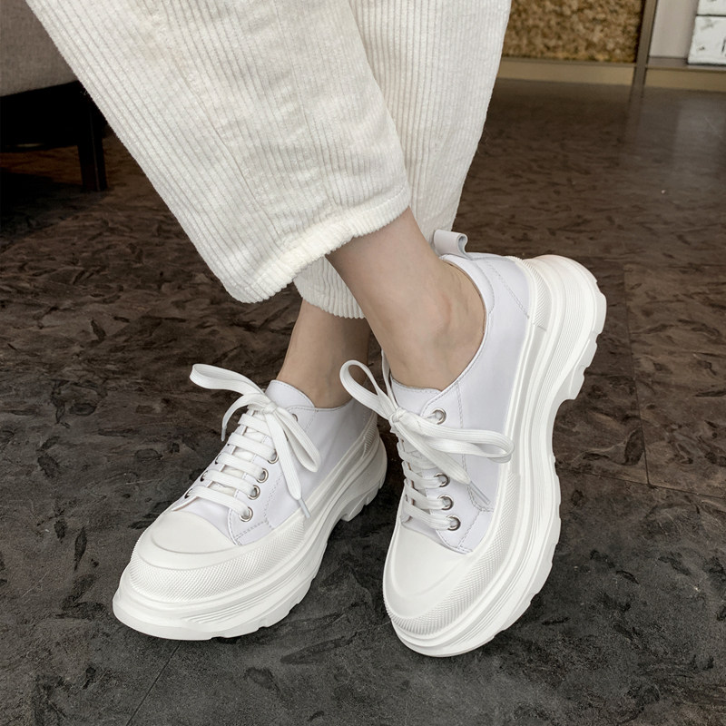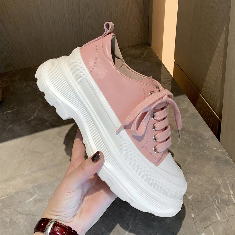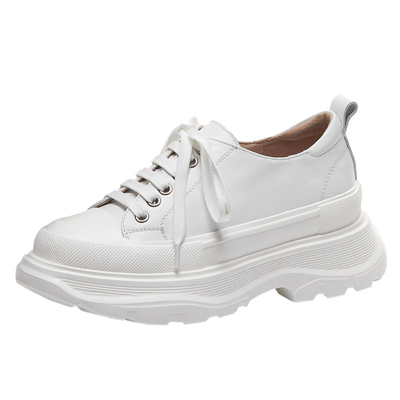 2022 Spring Autumn Season Bull Leather Thick Base Small White Shoes Casual Old Daddy Shoes Genuine Leather Heightening Pine Pastry Laces Sports Women Shoes