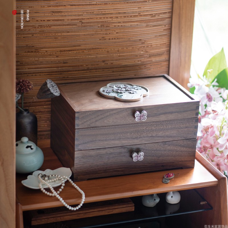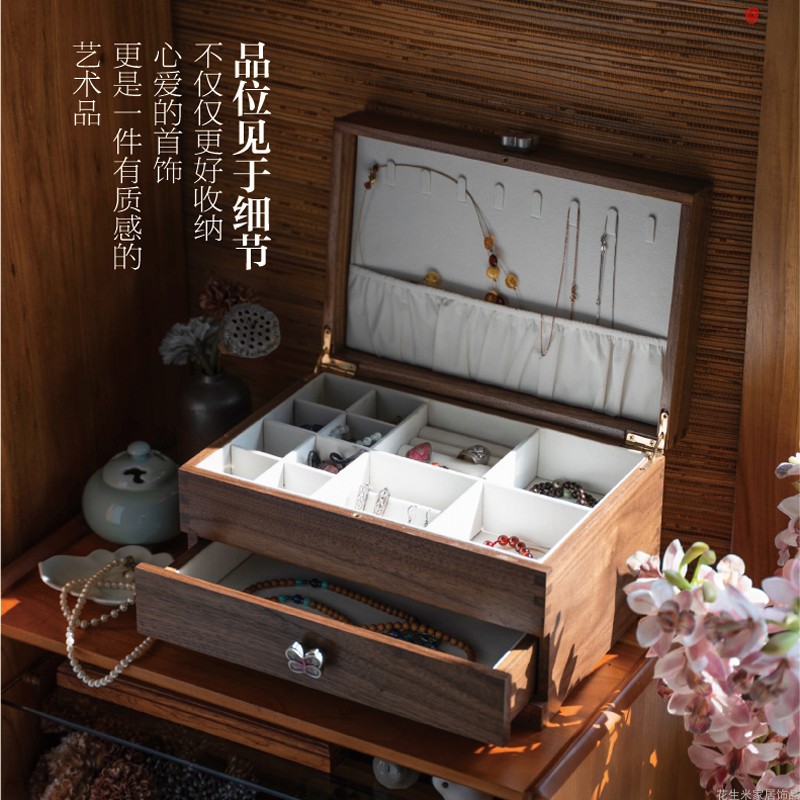 Jewelry box large-capacity multi-layer decoration Chinese black walnut solid wood with lined partition desktop storage box gift
