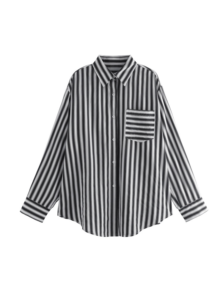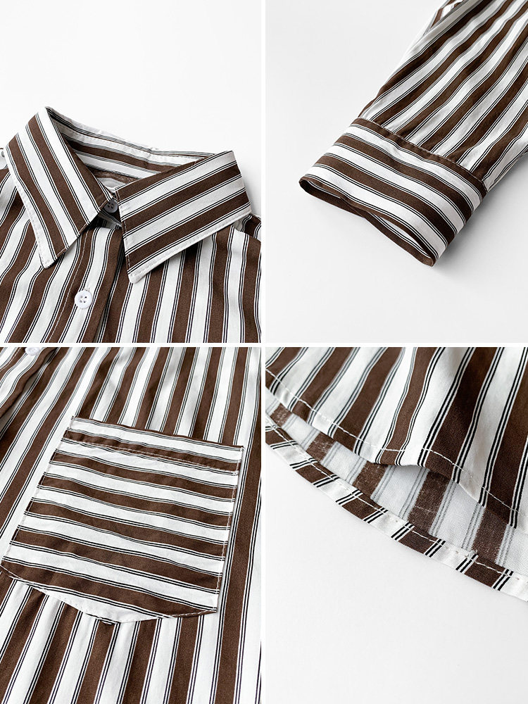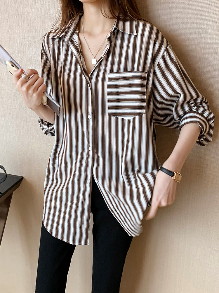 Striped Shirt Woman Design Sensation Small Crowd 2022 New Autumn Winter Light Cooked Retro Port Taste 100 Lap Vertical Striped Blouse