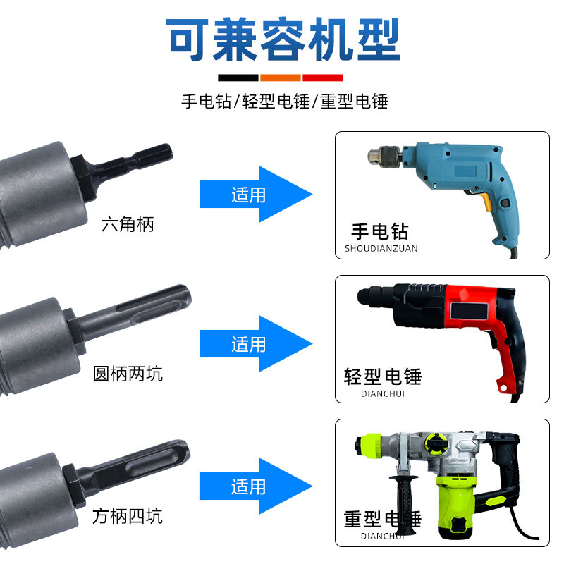 32mm square handle four pits for 32mm electric drill (for heavy electric hammer drills) 32mm round handle two pits and two slots (for light electric hammer drills) 42mm square handle four pits for 42mm electric drills (heavy