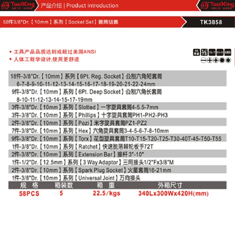 Tuojin Toolking 58 pieces 10mm metric tool set A3858 auto repair tool kit Hardware toolbox