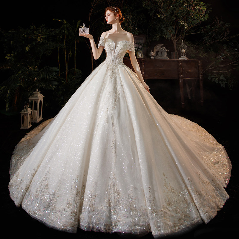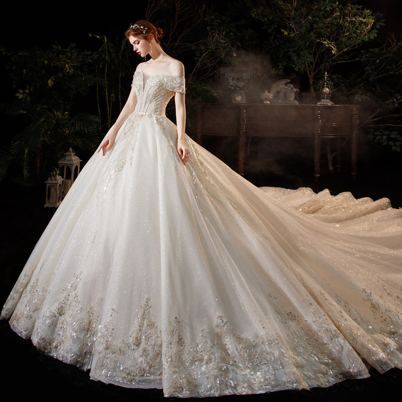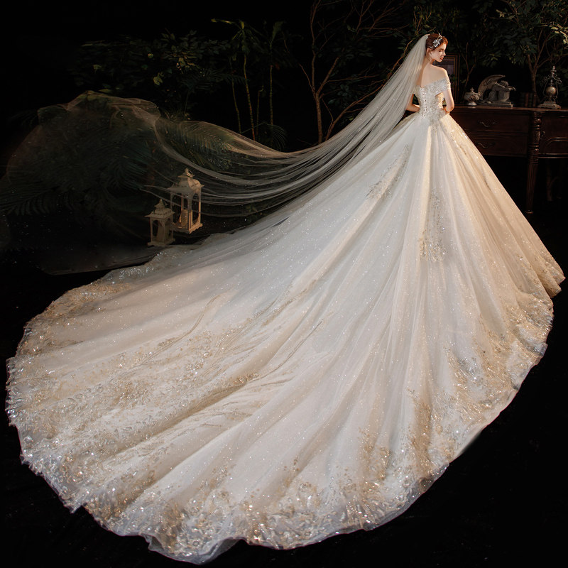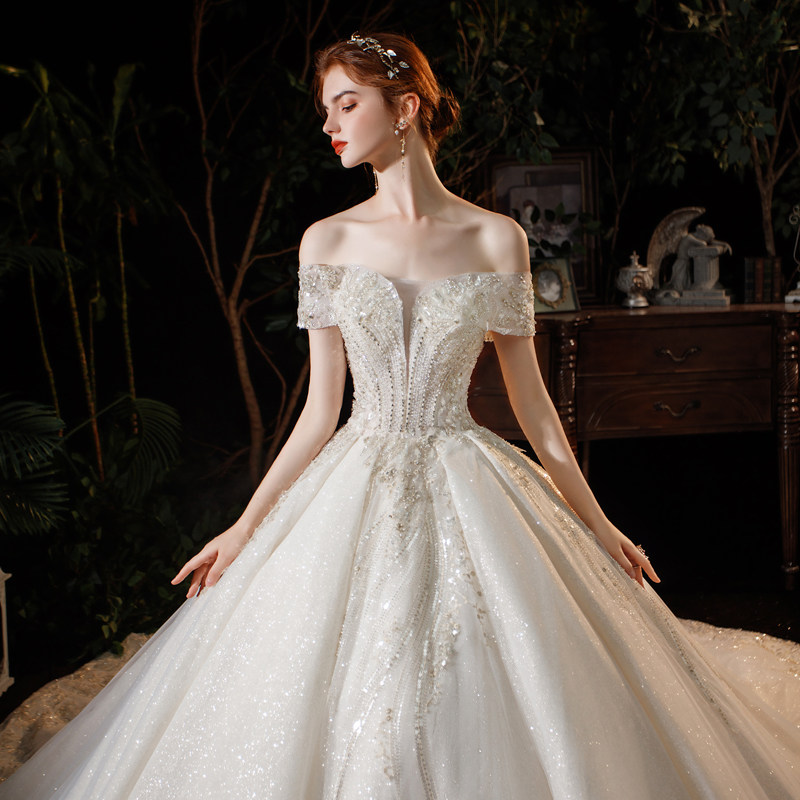 Starry main wedding dress 2021 new temperament bride high-end forest department word shoulder luxury heavy industry large tail light