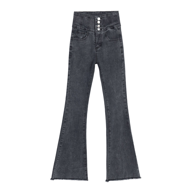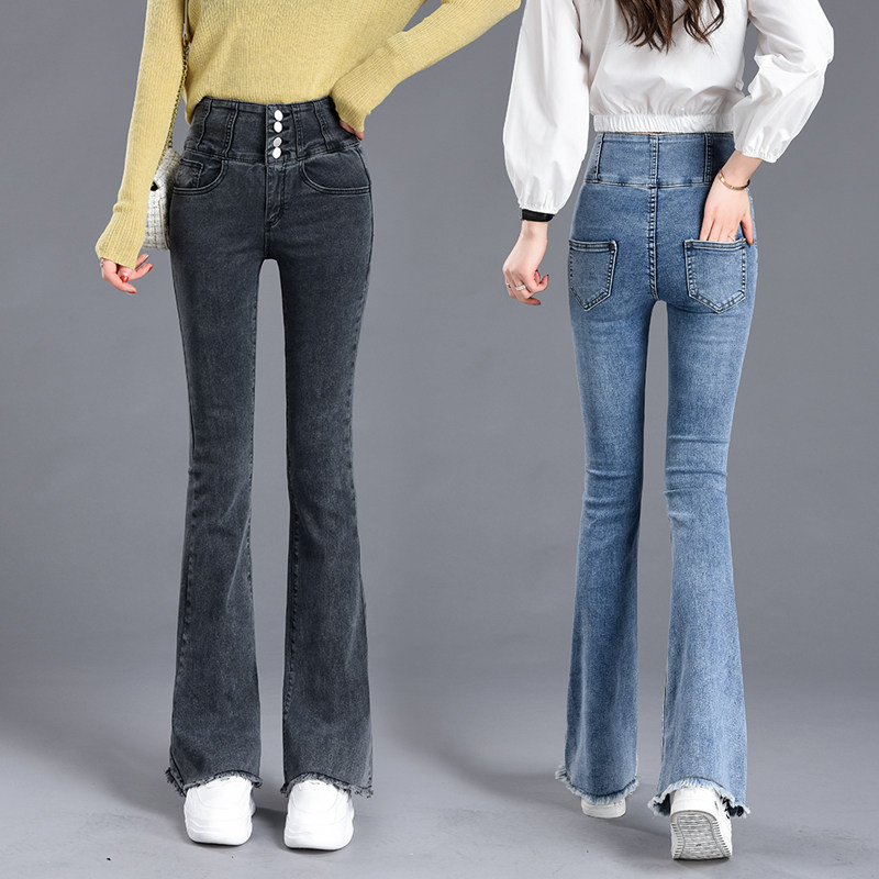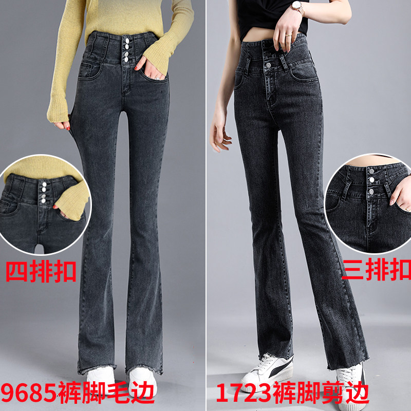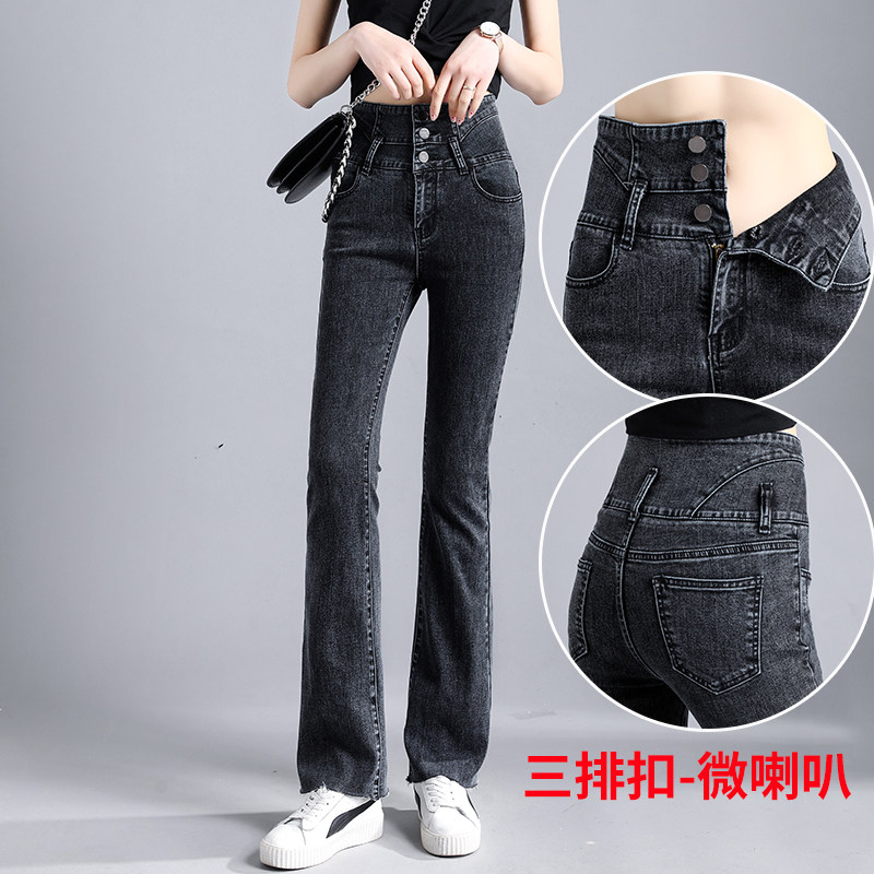Tide Card High Waist Denim Horn Pants Woman 2022 Chunqiu New display slim display high elastic body hair side wide-leg long pants