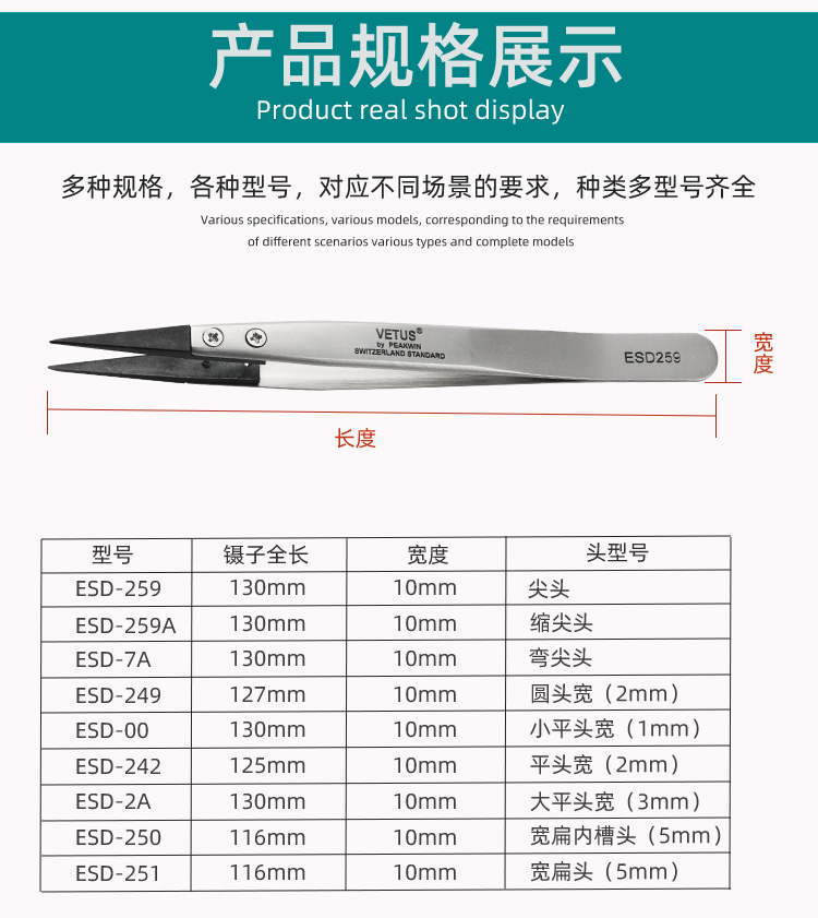 VETUS tweezers head replaceable ESD anti-static interchangeable head tweezers anti-static tweezers plastic head electronics factory