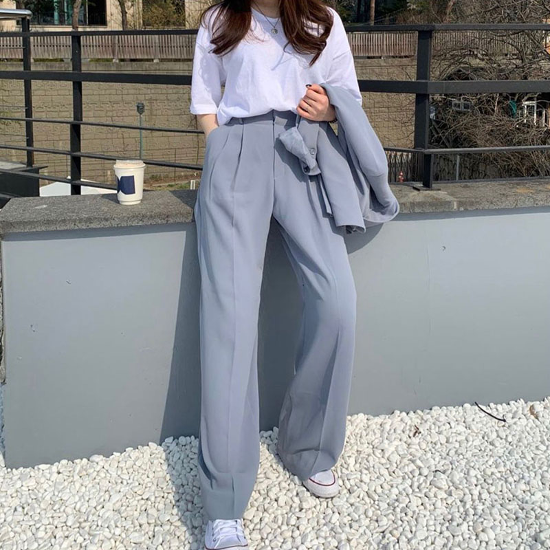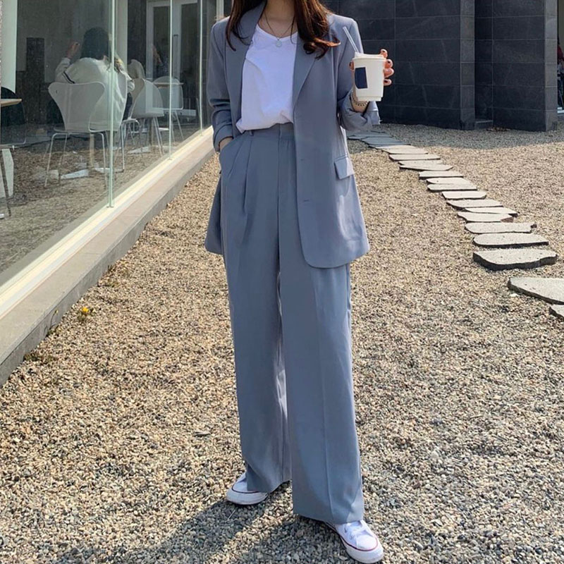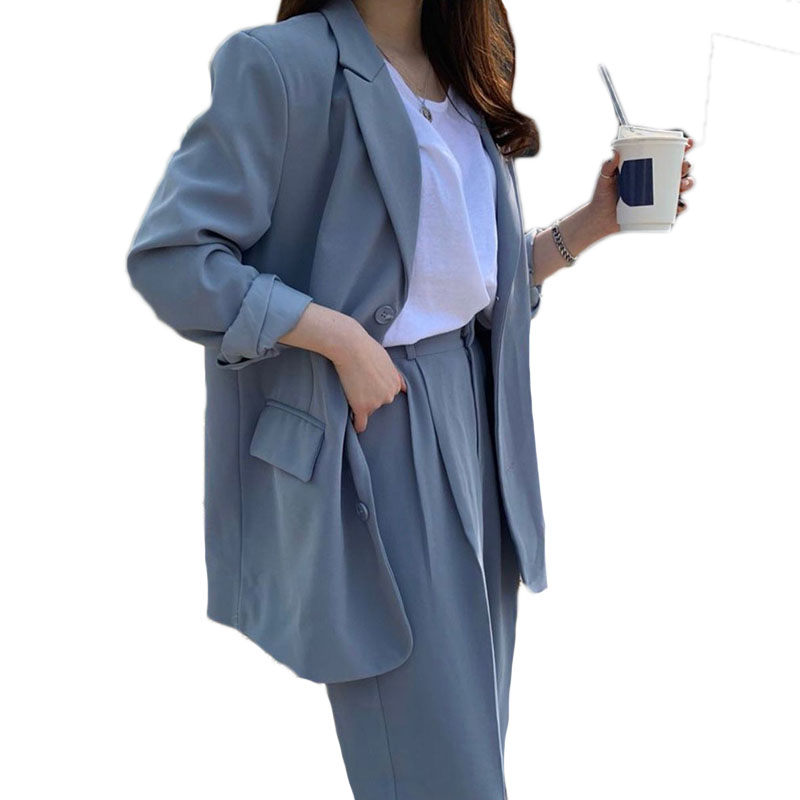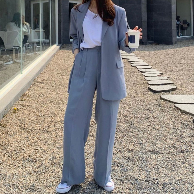 Large size fall light cooked wind casual fashion Three-grain buttoned suit jacket High waist straight cylinder tugging trousers Two sets of women
