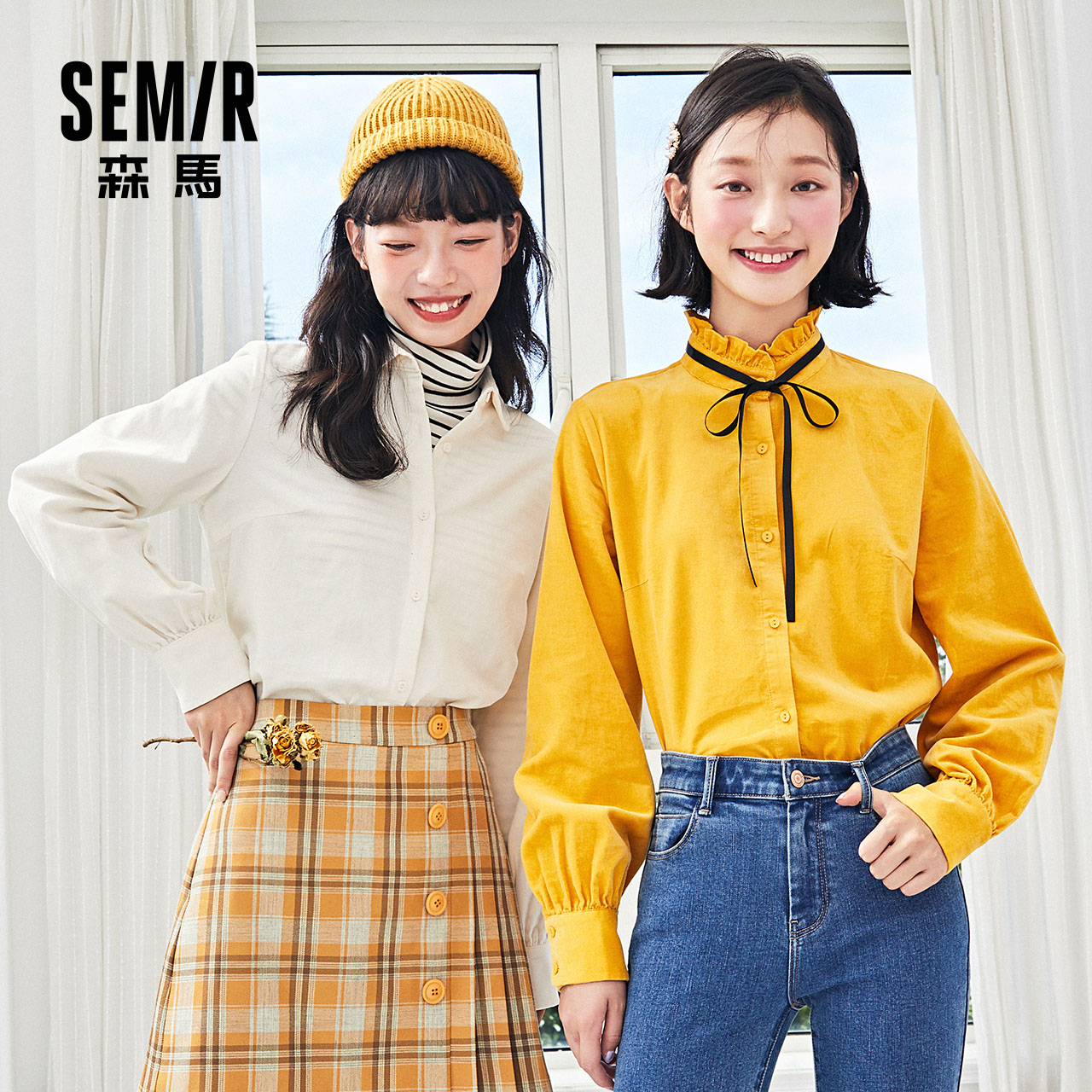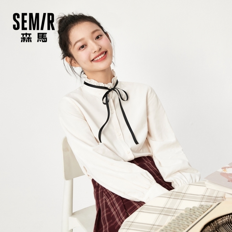Semir early spring shirt female bow tie collar shirt lady long-sleeved top white spring corduroy jacket ins - Taobao