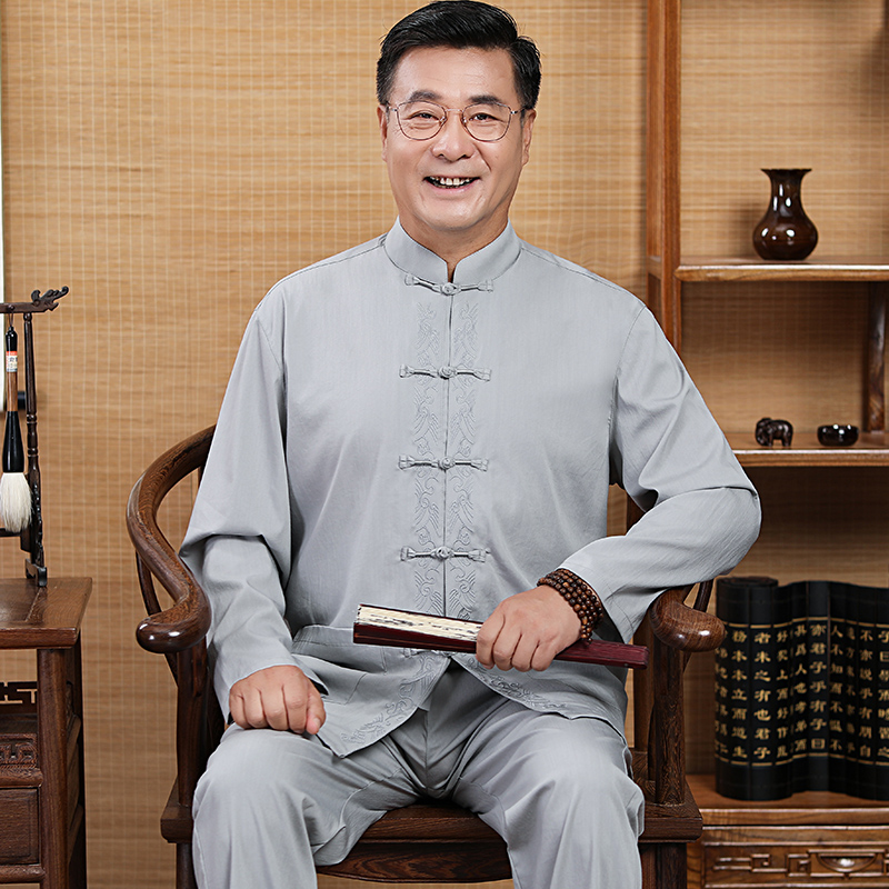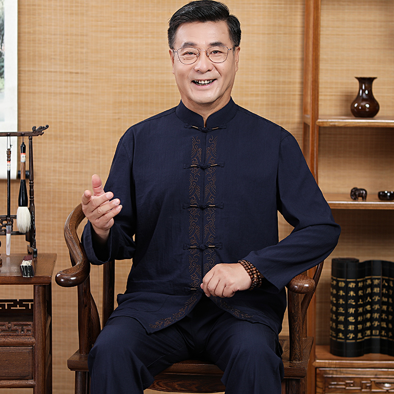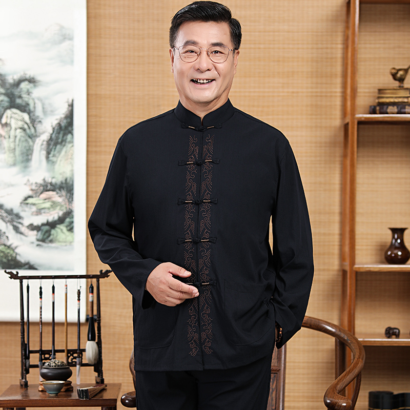 Tang Loaded Men's Cotton Linen Long Sleeve Suit Mid-Aged Shirt Spring Autummy Season Dad Dress Embroidered Chinese Grandpa Great Size Dress