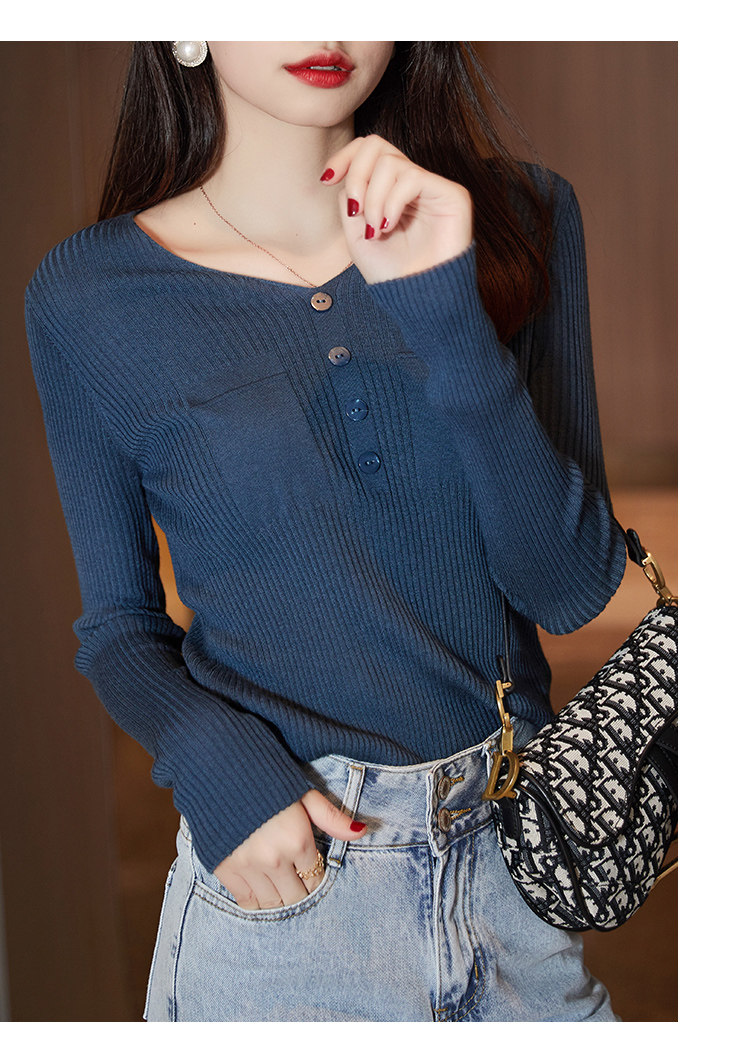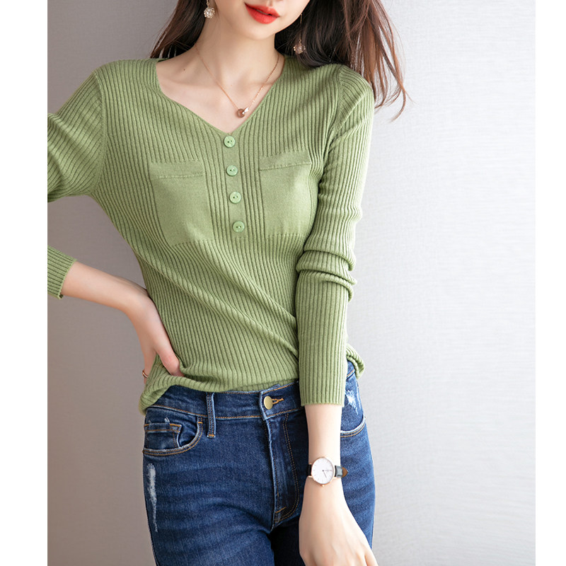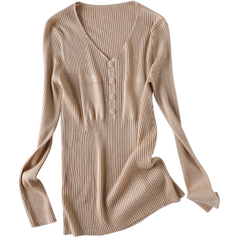 Khaki knit shirt top women autumn and winter 2021 New V collar interior long sleeve wool base shirt