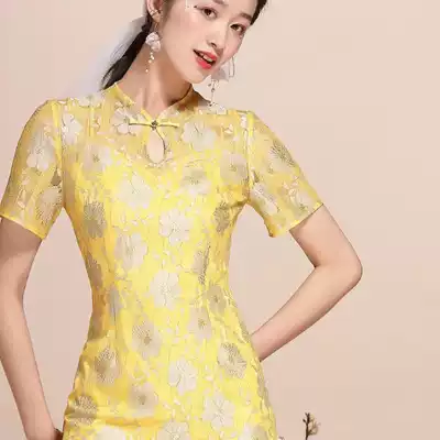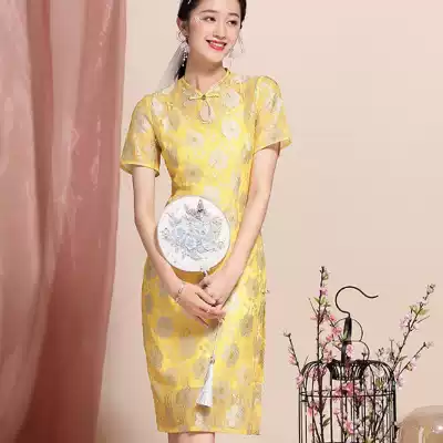 SHILUOLI Italian with accent waist cheongsam women's new romantic large size dress yellow Medium-length dress