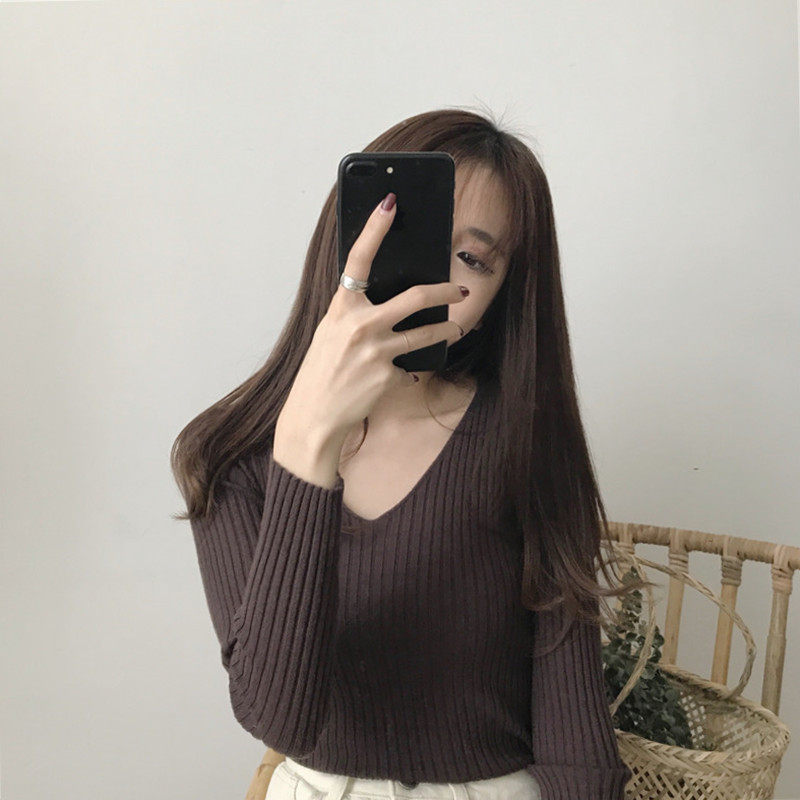 chic fall overboard with slim V collar knit cardiovert elastic body long sleeve headblouse for undershirt sweater