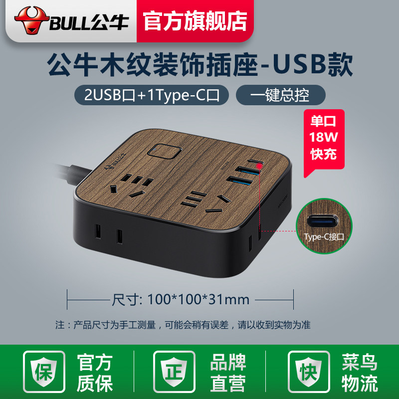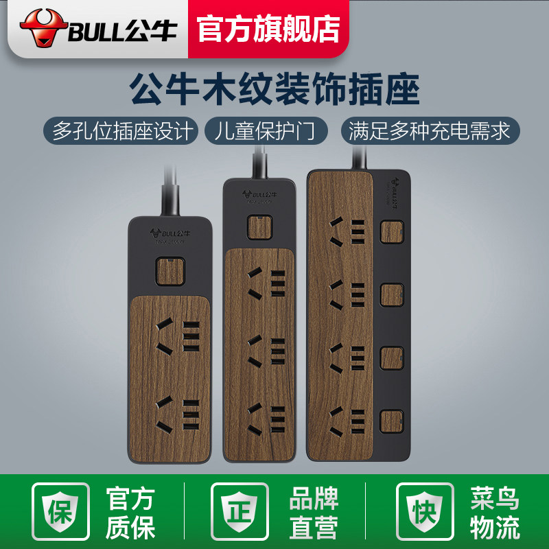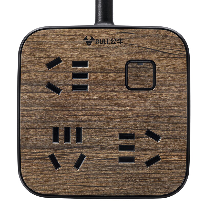 Bull socket wood grain fast charging row plug sub-control porous USB charging wiring board retro desktop extension cord plug row