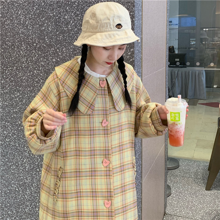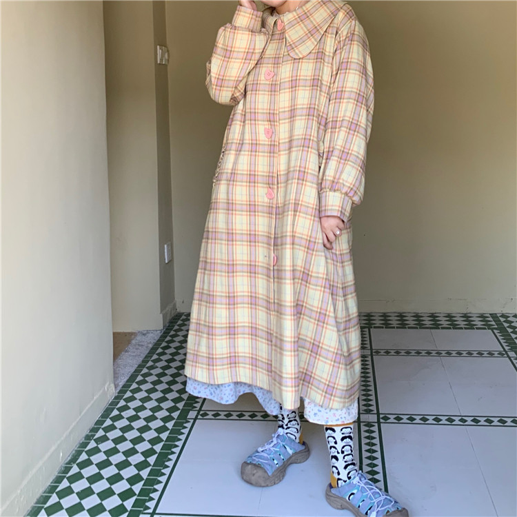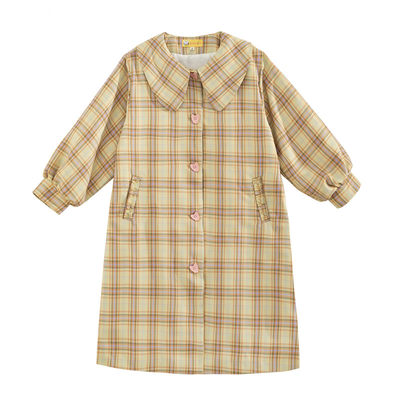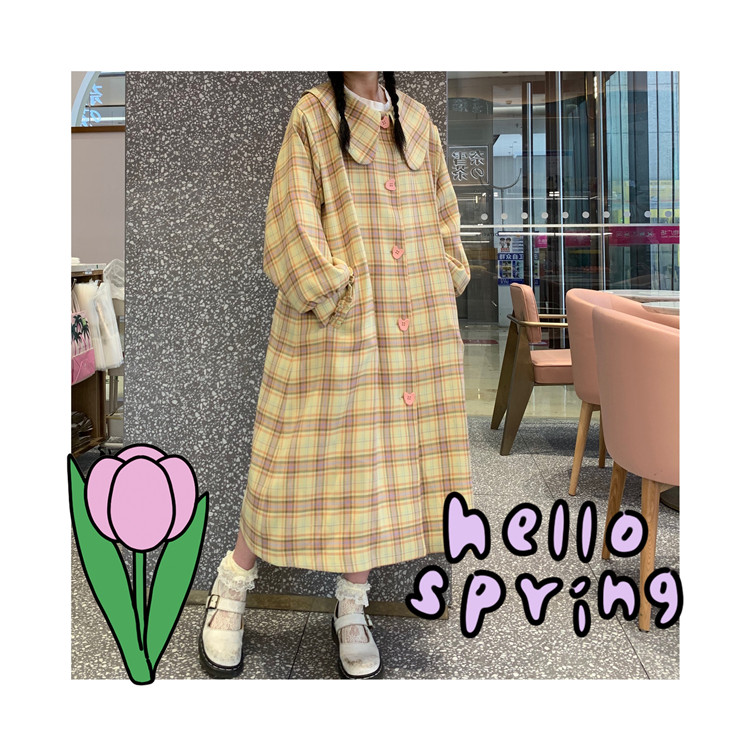 Omurice restaurant_Plaid pattern long-sleeved trench coat women's autumn Japanese style retro sweet temperament mid-length top