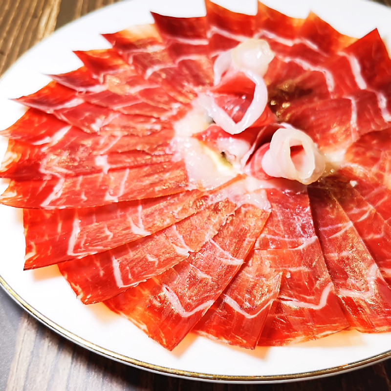 Ibero Montesano Black Pig in Ibero, Spain, with a white mark on the hind leg