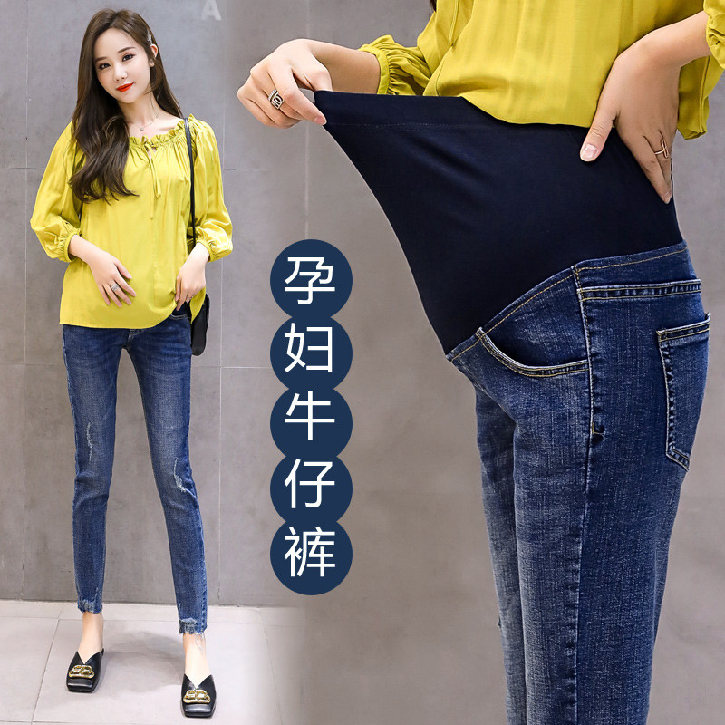 Pregnant women jeans nine short spring and autumn trousers casual hole tide trousers in 2020 new belly pants