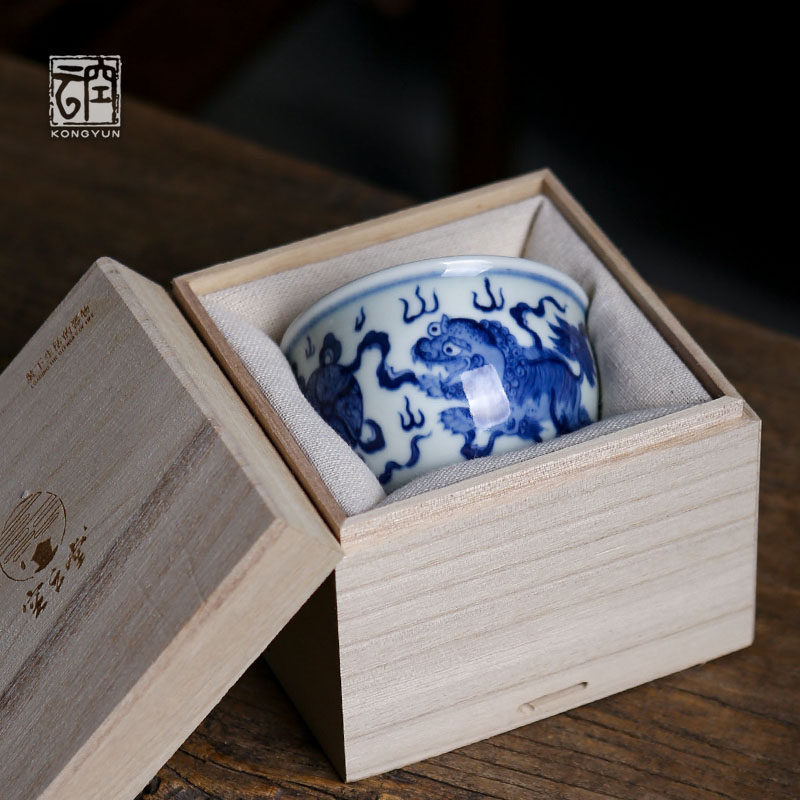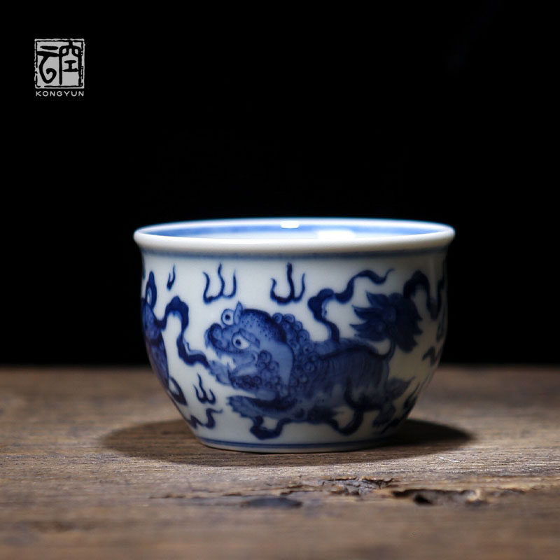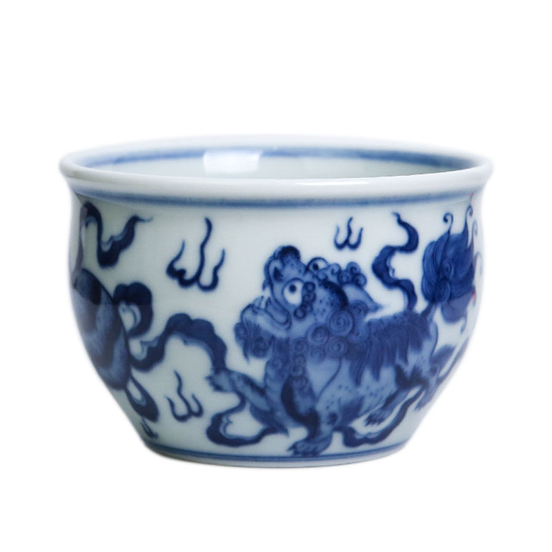 Empty clouds Jingdezhen hand-painted blue and white lion dance cylinder cup Large pressed hand kung fu ceramic tea cup tea cup master cup