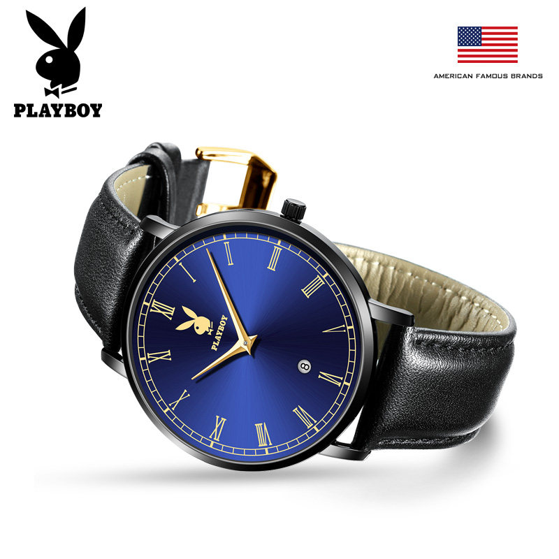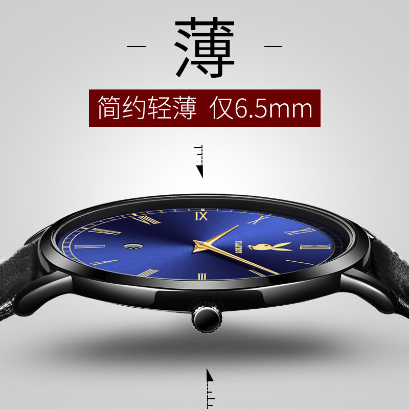 Black shell blue face black leather strap Playboy ultra-thin quartz watch silver shell black leather strap Playboy slim quartz watch silver shell white face black leather strap Playboy ultra-thin quartz watch