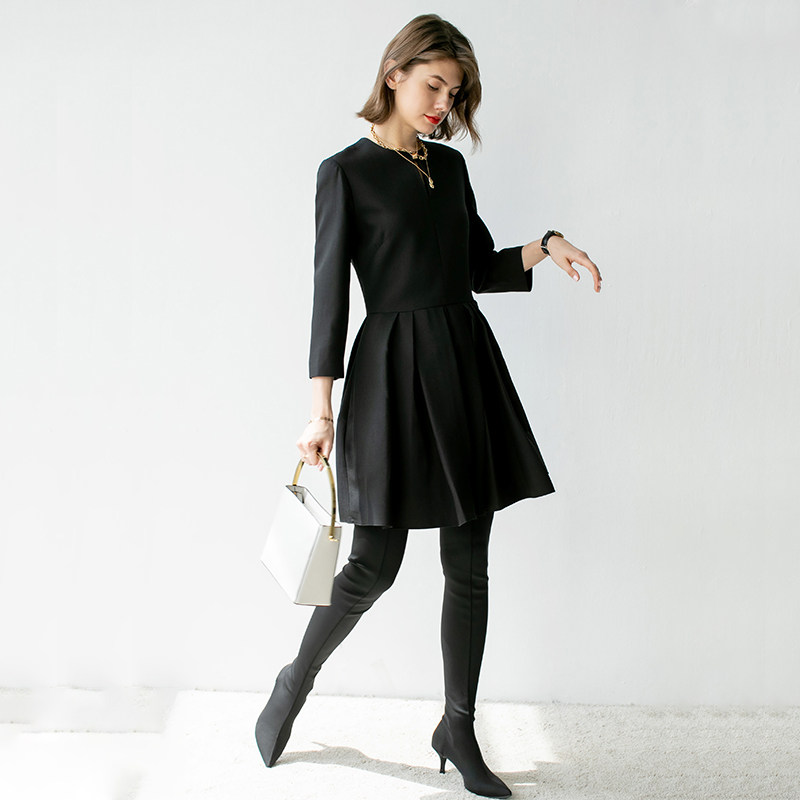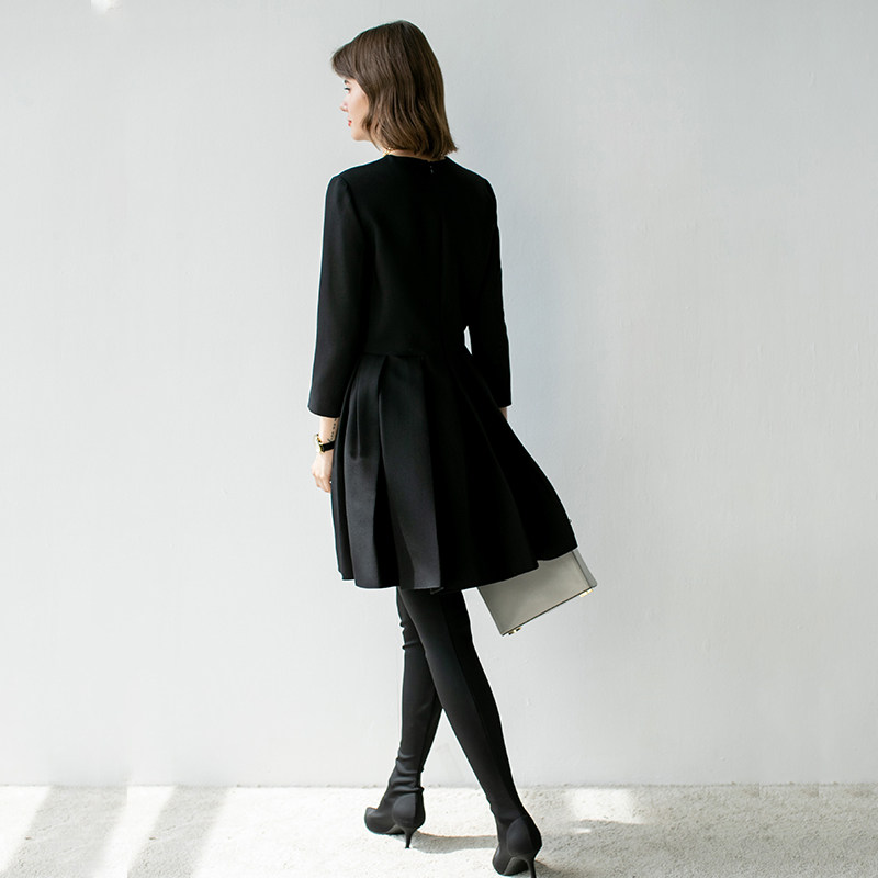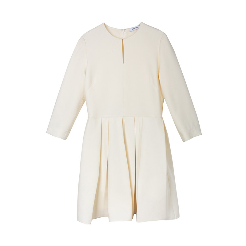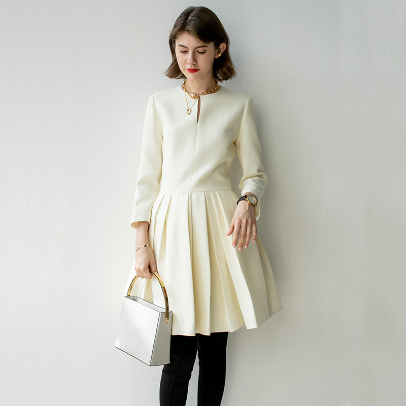 JADE SHADW Emerald Shadow Original Design Silk Wool Dress Round Neck Nine-quarter Sleeves Pleated Swing Skirt