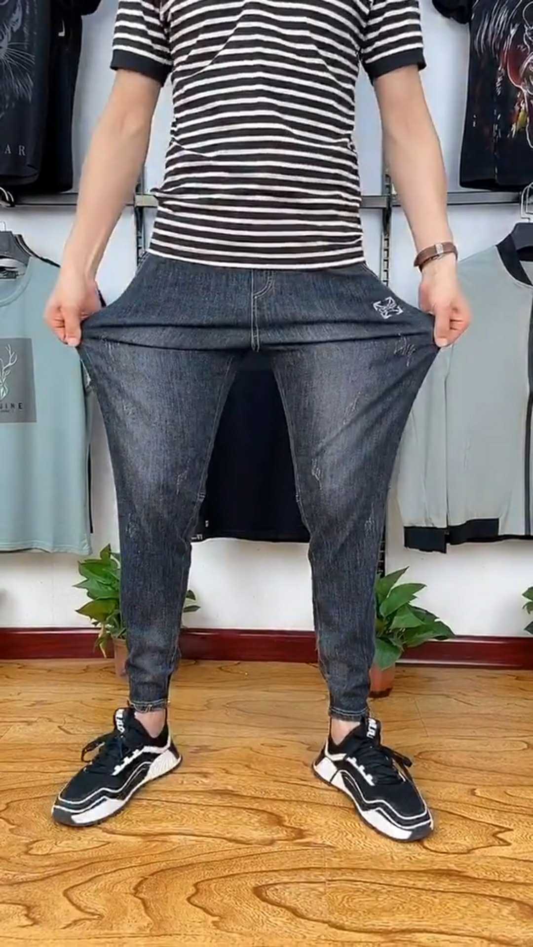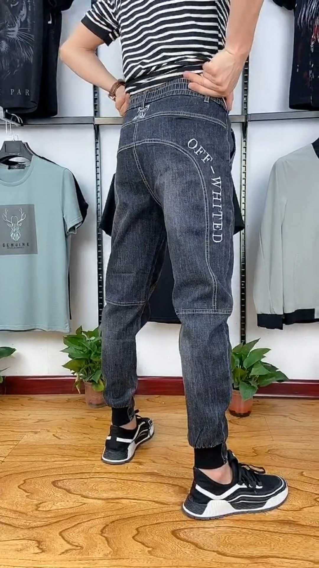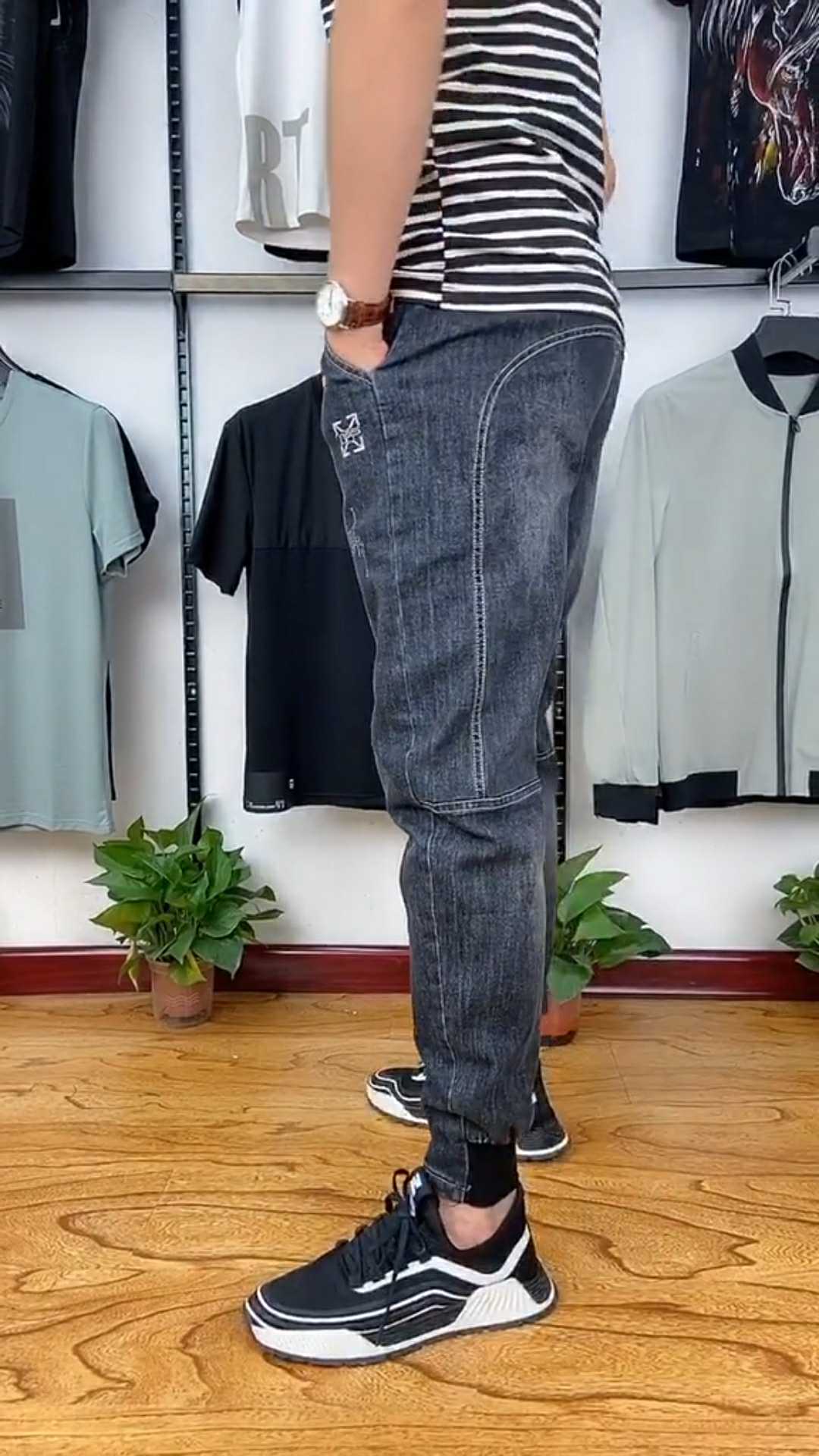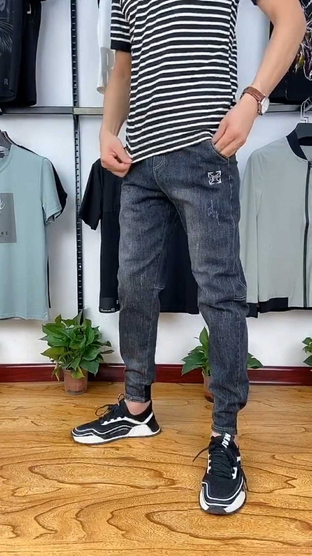 901-Small feet fashion men's slim jeans simple trousers elastic fashion semi-tight embroidery with letters