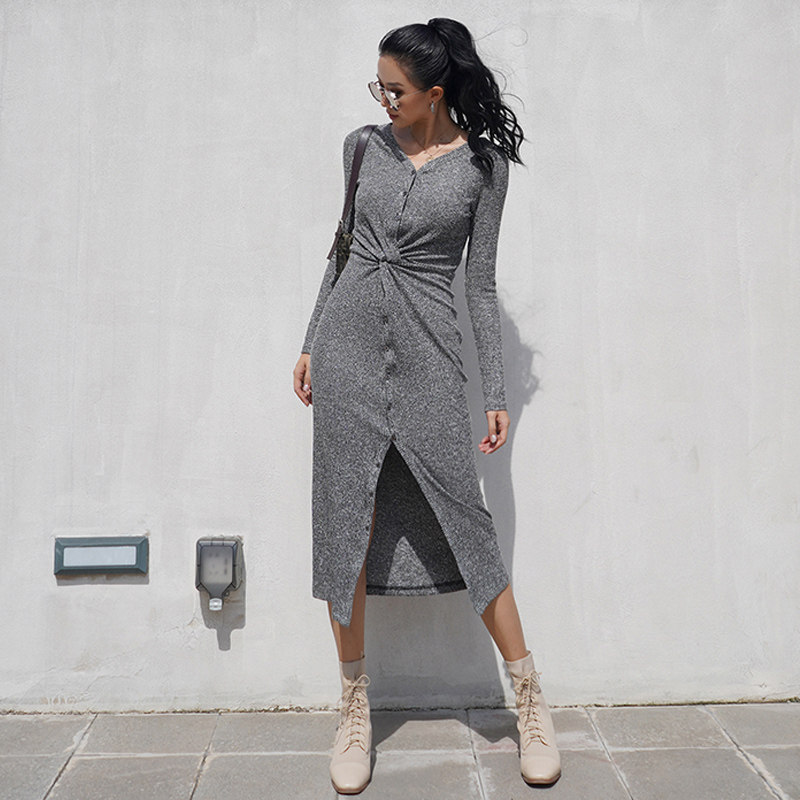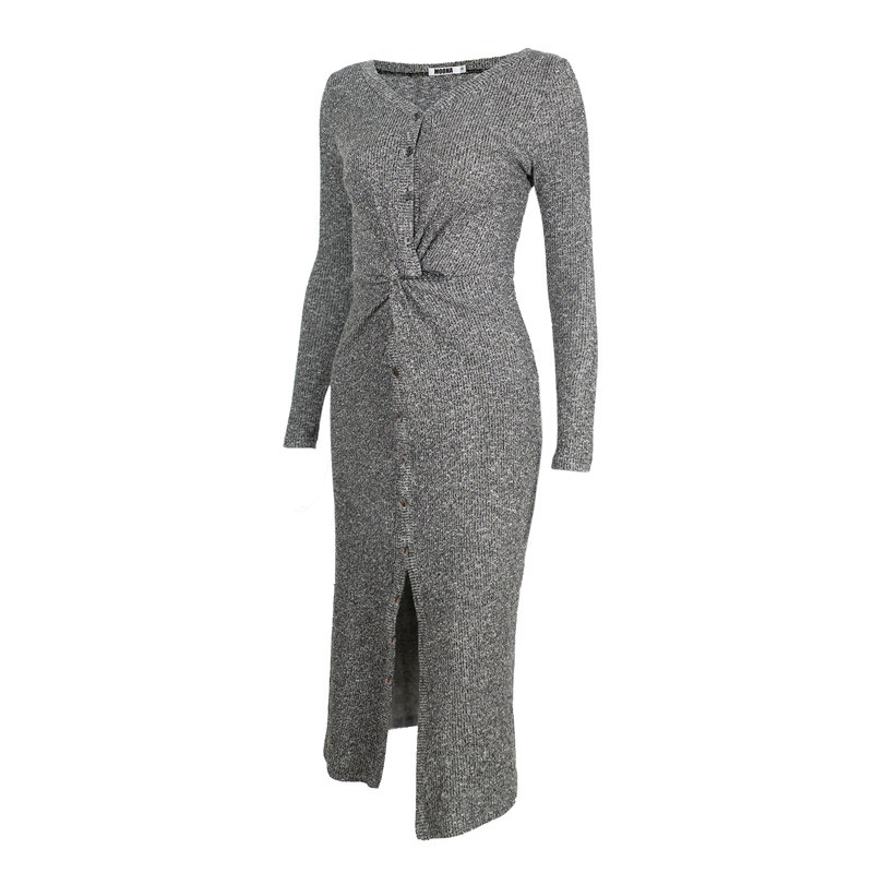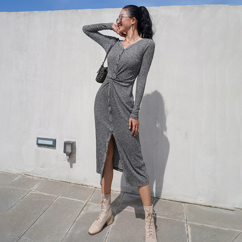 MOONA custom flower gray long-sleeved dress in spring and autumn with slits and slim fit in Europe and America