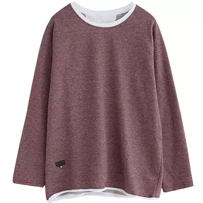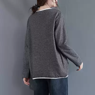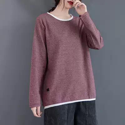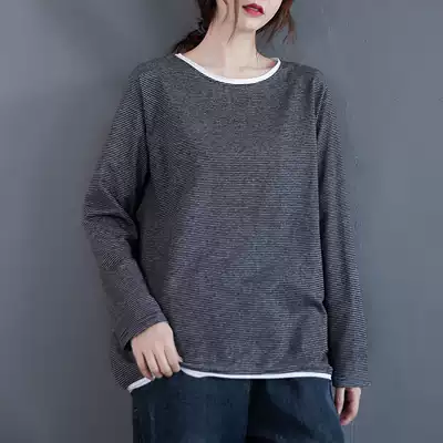 Literary pinstripe long-sleeved T-shirt women's 2020 autumn loose casual fake two-piece cotton all-match bottoming shirt top