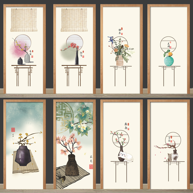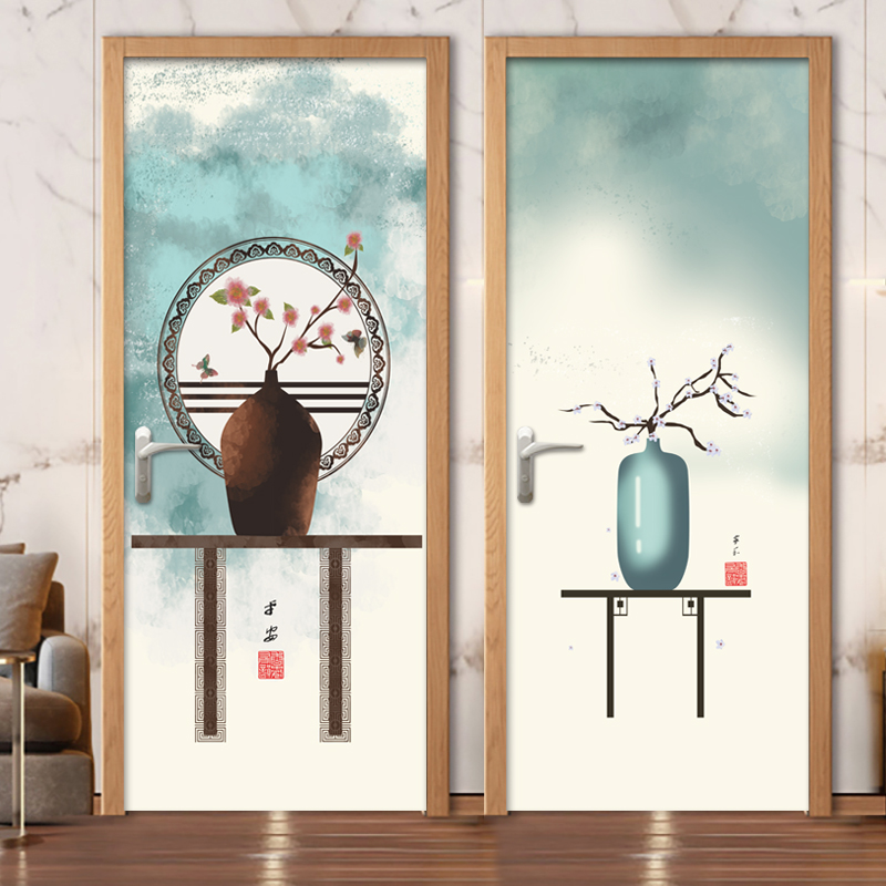 Creative Vase New Chinese Style Door Stickers Whole wooden door Renovated Waterproof Self-Glued Glass Ramen Decoration Sticker