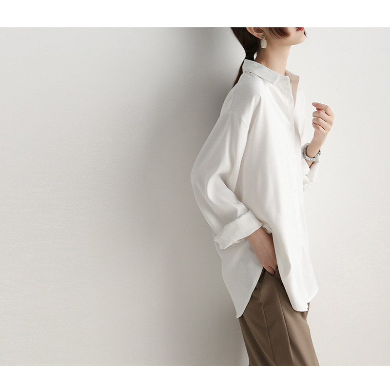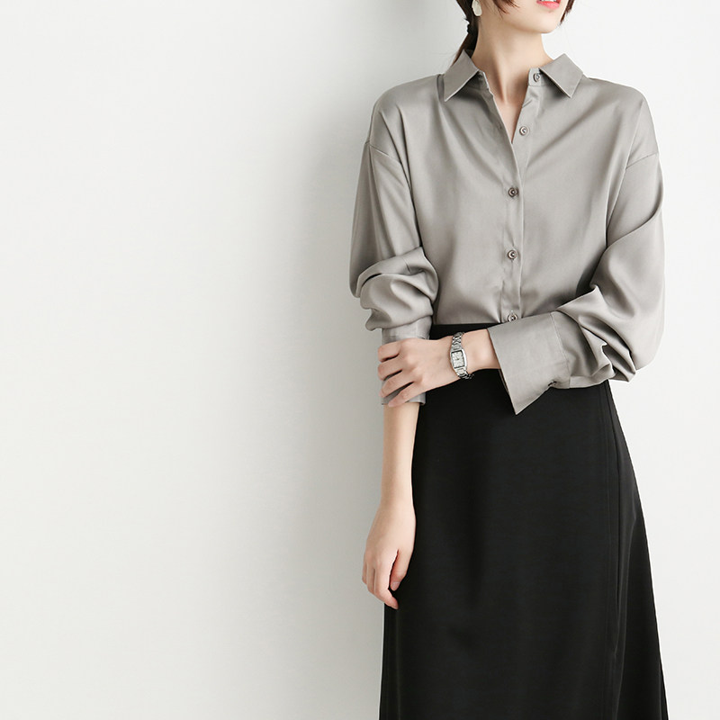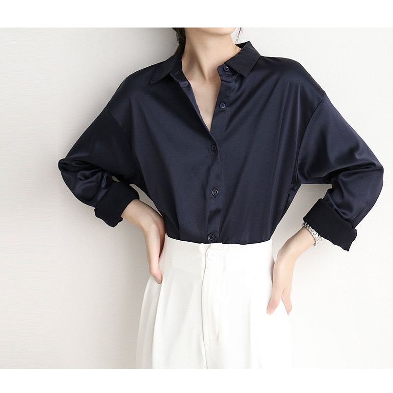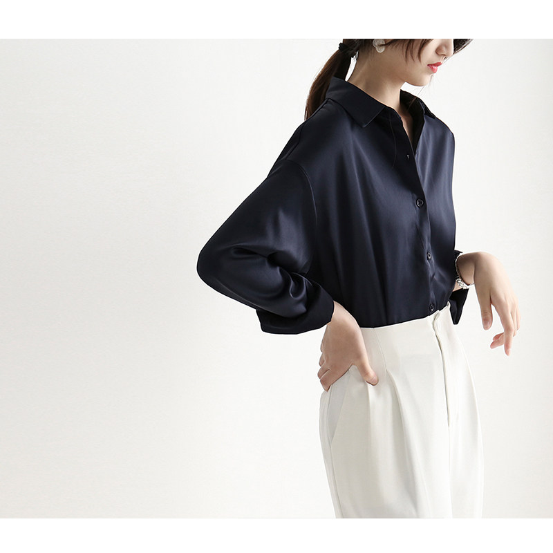 Casual chic polo collar retro Hong Kong style chic shirt women's satin drape loose and thin professional top