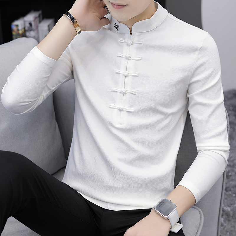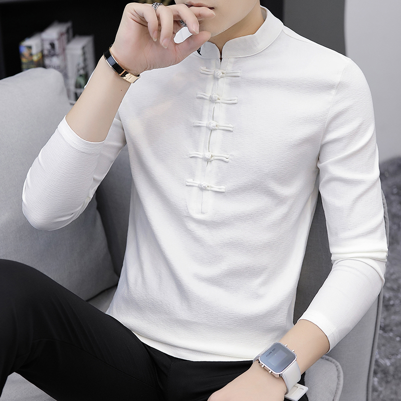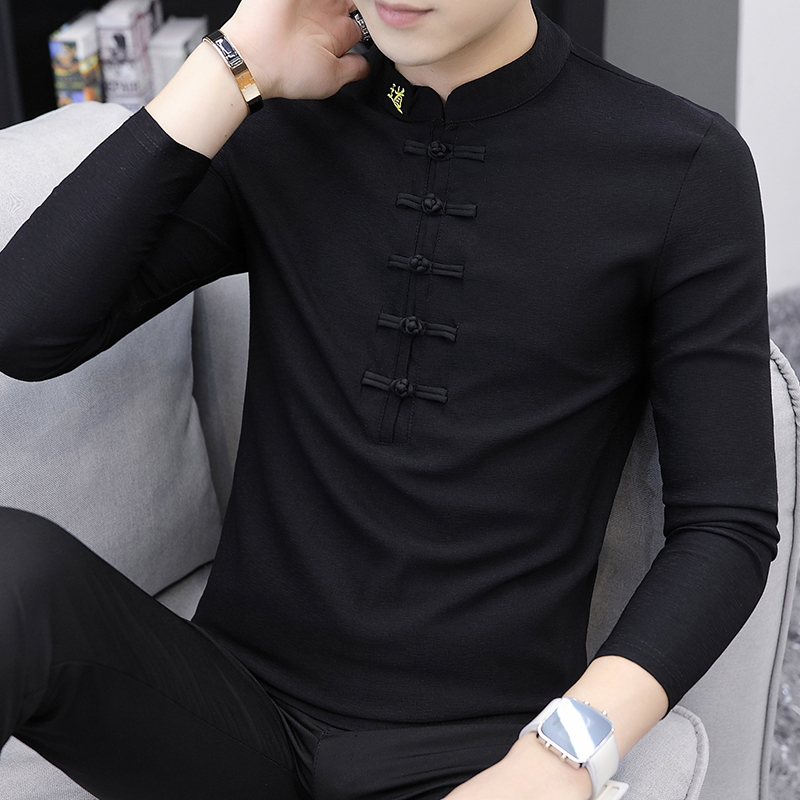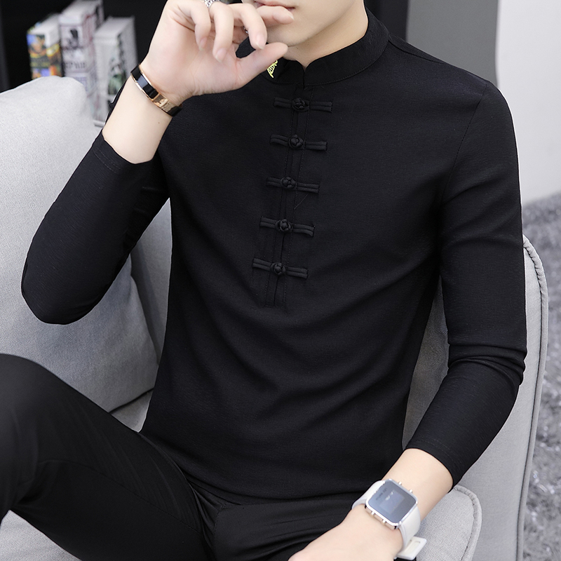 Stand-up collar long-sleeved T-shirt men's fashion brand 2020 autumn Chinese style retro buckle top Korean version of the trend slim T-shirt