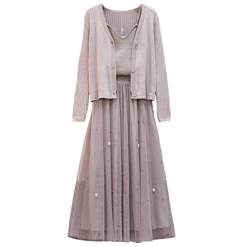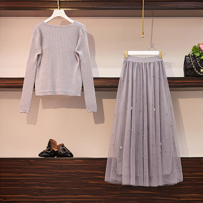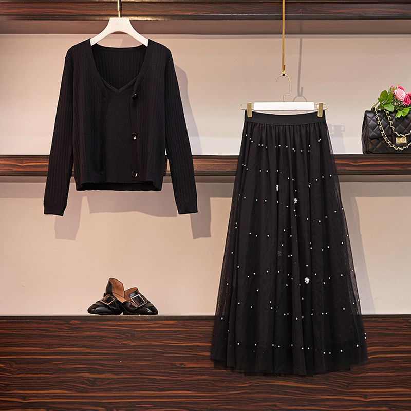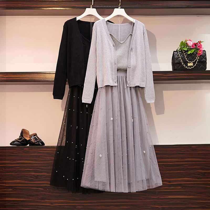 Large size women's clothing 2022 new autumn clothes slightly fat sister reduce age and thin suit Western style mesh dress three-piece suit
