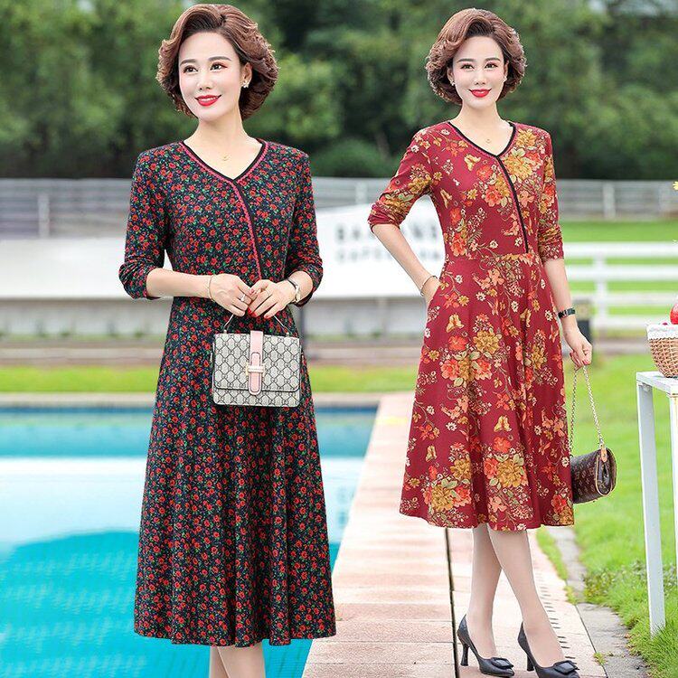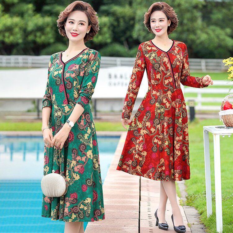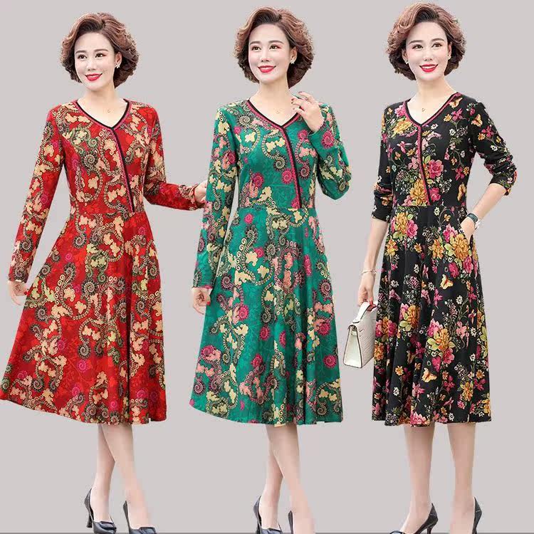 2020 new middle-aged mother autumn dress temperament middle-aged and elderly women's dress spring and autumn mid-length skirt is thin