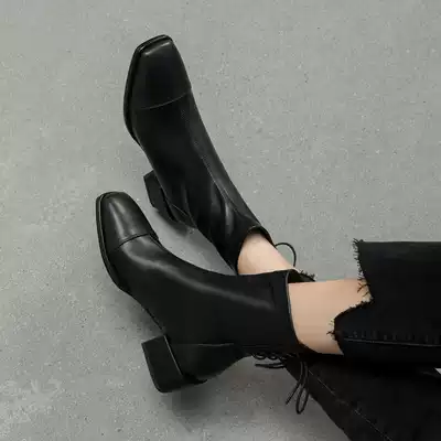 Square head thick heel short boots female spring and autumn single boots stretch thin boots autumn and winter Joker leather frosted boots